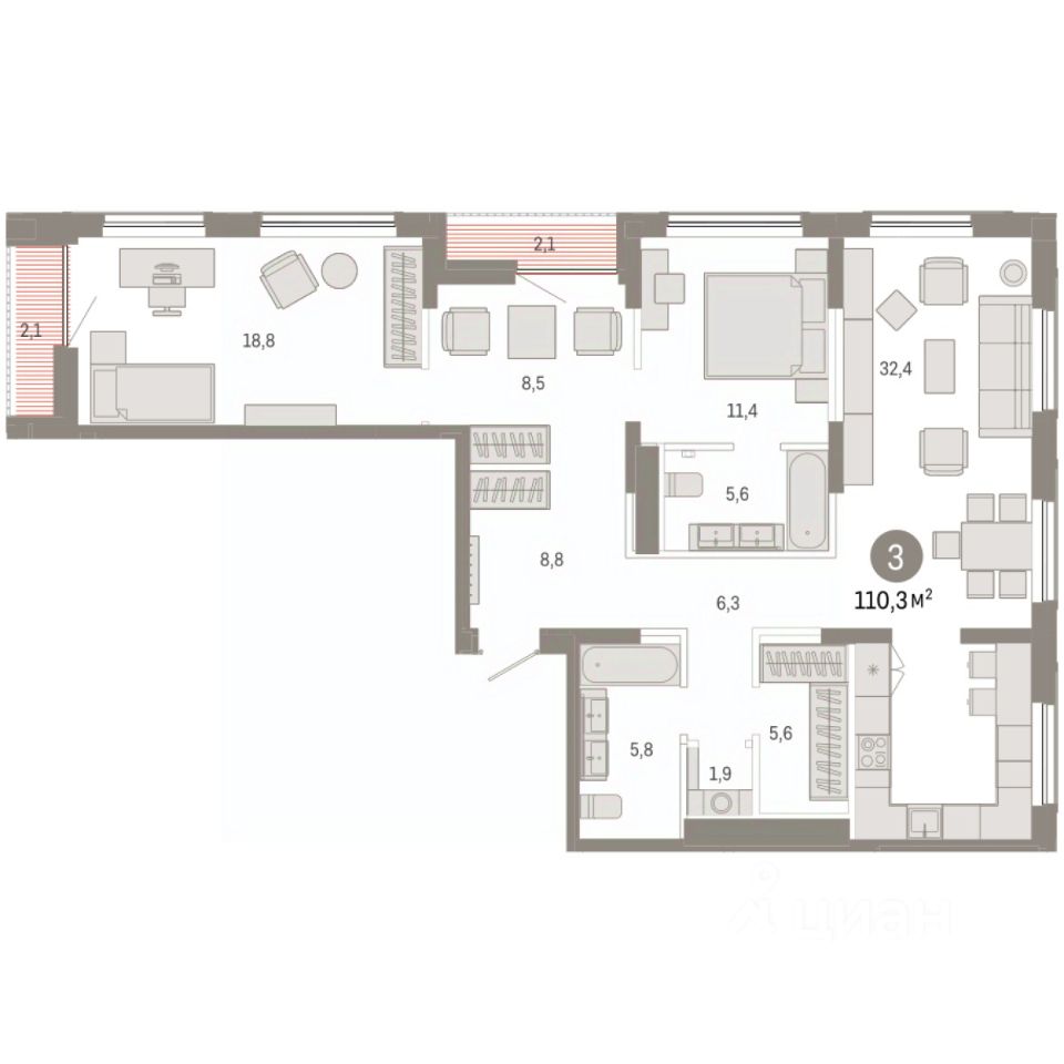 3-комн. квартира от застройщика с предчистовой отделкой в ЖК ''Зарека'' на 10 этаже. Общая площадь: 129.44 кв.м., жилая: 49.5 кв.м., площадь просторной кухни-гостиной: 48.4 кв.м. Угловая квартира, идеально подойдет любителям тишины и панорамных видов. В квартире два балкона, два совмещенных санузла. Высота потолков 2.7 м. Дом монолитный, многоподъездный, переменной этажности, от 6 до 16 этажей. Квартира находится в 1-й секции высотой 16 этажей в корпусе 5-2. На этаже 8 квартир. В подъезде 1 пассажирский и 1 грузовой лифт. Окончание строительства - 4 квартал 2026 года. Оформление сделки по договору долевого участия. Квартира с кухней-гостиной и тремя спальнями в жилом районе ''Зарека''. Особенности планировки: балкон, предчистовая отделка, разнесённые спальни. квартиры в нашей базе: ЗРК05.2-Ж1.10.8. Проект На планировочную структуру ''Зареки'' повлияла близость к автомобильному мосту Челюскинцев. Мы расположили жилые здания так, чтобы они постепенно удалялись от проезжей части. Приём напоминает лесенку: чем сильнее мост возвышается над участком застройки, тем дальше по отношению к нему стоят дома. Этот ступенчатый сдвиг позволил нам сформировать буфер между кварталами и оживлённой магистралью. Мы намерены высадить здесь высокие деревья и создать дополнительную защиту от дорожных шума и пыли. В границах нашего участка мы намерены разместить школу и два встроенных детских сада на 135 и 150 мест. Общественные пространства С севера на юг территорию будет пронизывать пешеходный бульвар. Мы мыслим это общественное пространство как главный центр притяжения. На нём будут сосредоточены основные детские игровые и спортивные зоны, места для встреч и спокойного отдыха. Он также сыграет роль мостика, ведущего к другим нашим проектам — ''Европейскому кварталу'' и ''Дому у озера''. Одна из базовых идей мастер-плана касается береговой линии. Сегодня озеленение этой территории носит стихииныи характер, а прямому доступу к Туре препятствует дамба. Мы хотим благоустроить пространства у воды и открыть их для людей. Архитекторы спроектировали систему многоярусных троп и спусков к реке, смотровые площадки и места для активного отдыха и пикников. #z4fE0F