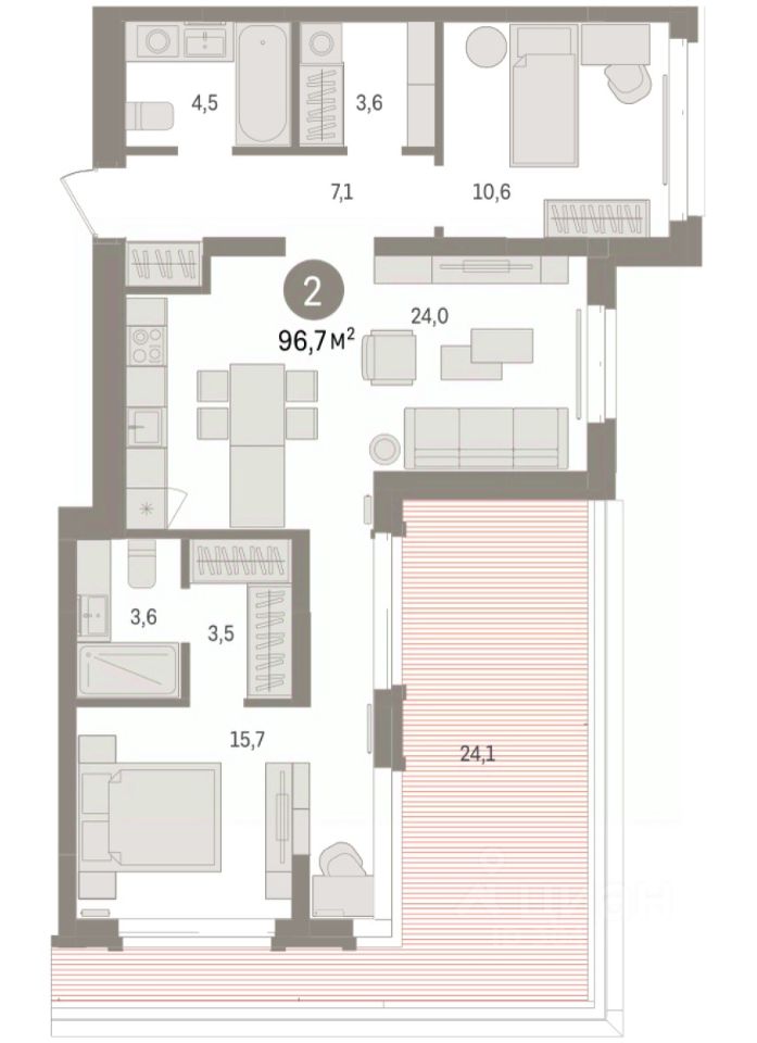 Продается двухкомнатная квартира с предчистовой отделкой в Кварталы ''На Минской'' на 3 этаже. Общая площадь: 96.71 кв.м., жилая: 26.3 кв.м., площадь просторной кухни-гостиной: 24 кв.м. Квартира угловая, окна oбecпeчивaют paвнoмepнoe ocвeщeниe в тeчeниe дня. В квартире один балкон, два совмещенных санузла. Наличие террасы в квартире дает возможность для создания зон отдыха в кругу семьи и друзей. Высота потолков 2.7 м. Дом монолитный, многоподъездный, переменной этажности, от 7 до 16 этажей. Квартира находится в 3-й секции высотой 7 этажей в корпусе 1. На этаже 5 квартир. В подъезде 1 грузовой лифт. Окончание строительства - 4 квартал 2026 года. Оформление сделки по договору долевого участия. Квартира с кухней-гостиной и двумя спальнями в кварталах ''На Минской''. Особенности планировки: балкон, предчистовая отделка, разнесённые спальни. квартиры в нашей базе: МНС01-Ж3.3.4. В сердце города Кварталы ''На Минской'' находятся в самом центре. За десять минут можно дойти до площади 400-летия Тюмени и Большого Драматического театра, Тюменского индустриального и медицинского университетов, спортивного комплекса ''Строймаш'', ТРЦ ''Гудвин'' и ''Премьер'', Тюменского технопарка. Поблизости много детских садов, школ и поликлиник. Пространство разного опыта Создавая кварталы ''На Минской'' мы вдохновлялись Хакскими дворами в Берлине и улицей Давида Агмашенебели в Тбилиси. И первые и вторая — яркие разнообразные пространства, сформированные прогрессивными архитекторами и притягивающие городских интеллектуалов. Престижная недвижимость здесь соседствует с барами, ресторанами, креативными кластерами и бюро, дизайнерскими лавками. Полезные улицы Кварталы ''На Минской'' свяжет сеть променадов, автомобильных проездов и велодорожек. Уличный фронт проекта мы сформируем с помощью аллейной посадки деревьев. Они создадут тень для ресторанов и кафе на первых этажах, визуально отделят проезжую и пешеходную части, снизят объём пыли и уровень шума. Мы реализуем проект в районе с развитой базовой инфраструктурой. И поэтому тщательно подошли к программированию коммерции, посчитав, что её основная задача — ''закрывать'' более высокие потребности жителей. Здесь может появиться пекарня с вкусными круассанами, турагентство на случай, если захочется перезимовать в Сочи, массажный кабинет, ресторан, когда надоело есть дома и многое другое. #z499bC