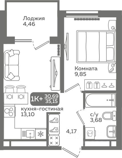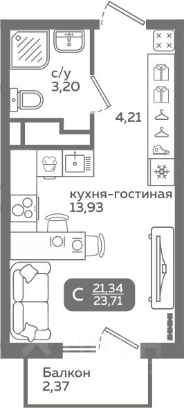 Студия отличный вариант для студентов и прогрессивной молодежи Самый популярный формат квартир! •Кухня-гостиная с двумя окнами для удобного зонирования •Просторный санузел, где вместится все необходимое •Вместительный коридор с нишей под шкаф-купе