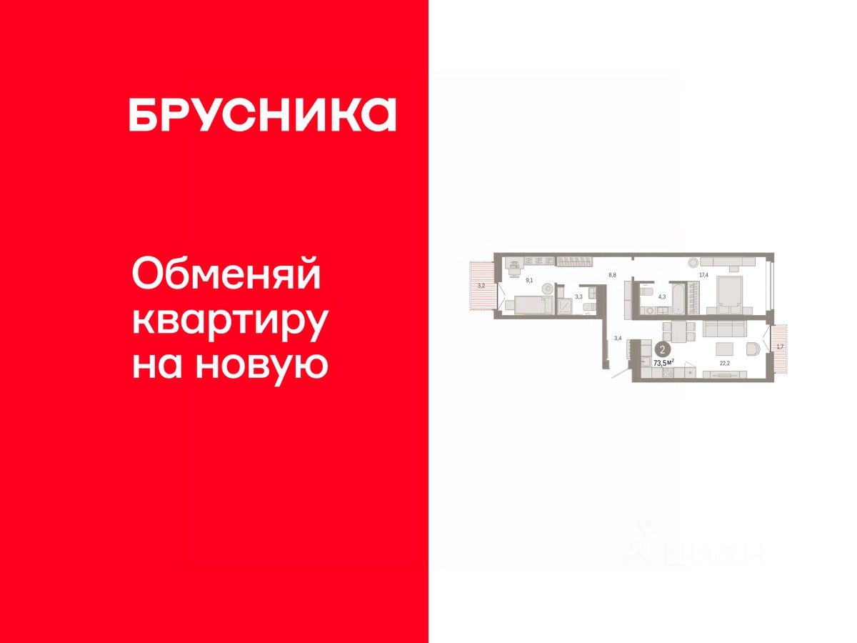 2-комн. квартира от застройщика с предчистовой отделкой в ЖК ''Республики 205'' на 3 этаже. Общая площадь: 73.46 кв.м., жилая: 26.5 кв.м., площадь просторной кухни-гостиной: 22.2 кв.м. Квартира - распашонка, без проходных комнат, окна выходят на paзные стороны дома. В квартире два балкона, два совмещенных санузла. Высота потолков 2.7 м. Купить квартиру можно с помощью программ покупки от застройщика Брусника: - ипотека по эксклюзивной ставке с помощью в получении положительного кредитного решения через сервис ипотечный брокер, - квартиры в рассрочку без процентов от застройщика Брусника, - обмен квартиры на новую. Получить одобрение ипотеки или рассрочку, а также осуществить обмен квартир можно онлайн. Дом монолитный, многоподъездный, переменной этажности, от 7 до 16 этажей. Квартира находится в 5-й секции высотой 7 этажей в корпусе 2. На этаже 7 квартир. В подъезде 1 грузовой лифт. Начало строительства - 1 квартал 2024 года. Окончание строительства - 1 квартал 2026 года. Оформление сделки по договору долевого участия. Район Проект расположен в границах улиц Пермякова, Энергетиков, Воровского и Республики. До центра города — 10 минут на машине. Рядом — автомобильная развязка на пересечении улиц Пермякова и Республики. В шаговой доступности есть школы, детские сады, поликлиники, крупный торговый центр, автовокзал и несколько скверов. Проект ''Республики 205'' — это проект комплексного развития территории, уникальный по своему наполнению. Переосмысляя бывшую территорию завода медицинского оборудования, мы создадим новое место силы — микрорайон, насыщенный деловой, развлекательной, рекреационной, игровой, образовательной и медицинской инфраструктурой. До каждого полезного сервиса здесь можно будет дойти за 15 минут. Локальными центрами ''Республики 205'' будут общественные пространства — скверы, парки, бульвары и площади. В границах нашего участка мы намерены разместить школу, рассчитанную на 1550 учеников, два детских сада на 300 мест и встроенный детский сад на 100 мест. В одном из цехов бывшего завода расположится креативный кластер ''Кузница''. Он станет площадкой для нескольких институций — галереи, лектория, книжного магазина-библиотеки, кинобара и точек креативного pop-up-ритейла. Пешеходные бульвары внутри района соединят между собой улицу ресторанов, детские и спортивные площадки, событийную площадь и летний кинотеатр. Идентификатор квартиры по базе застройщика: РСП-02-5-5. #Z3ffwE