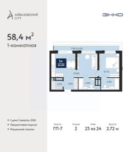 Успейте оформить бронирование на этих условиях, срок акции ограничен! Стоимость квартиры указана со скидкой, ваша экономия составит 486,596 руб. Звоните, мы вам все подробно расскажем. 1-комн. квартира с предчистовой отделкой в ЖК ''Айвазовский City'' на 23 этаже. Общая площадь: 58.4 кв.м. Высота потолков 2.72 м. Дом монолитный, многоподъездный, переменной этажности, от 9 до 24 этажей. Квартира находится во 2-й секции высотой 24 этажа в корпусе ГП-7. На этаже 7 квартир. В подъезде 1 пассажирский и 2 грузовых лифта. Окончание строительства - 3 квартал 2026 года. Оформление сделки по договору долевого участия. Новый жилой район располагается в живописном месте на берегу Туры в центральной части города. Принципиально новое пространство для жизни в центре современного города для тех, чьи мечты сбываются, кто нацелен на постоянный рост, перемены к лучшему для себя и своих близких.Каждая деталь Айвазовский City вдохновляет и заряжает на новые свершения: авторская архитектура, сбалансированная продуманная инфраструктура, дизайнерские дворы со спортивными и детскими площадками, парковые зоны с фонтанами, водный канал, украшающий центральный прогулочный маршрут района и многое другое. В 2019 года проект стал лауреатом престижной премии Urban Awards 2019 в номинации ''Лучший строящийся региональный жилой комплекс бизнес-класса''. Главная особенность Айвазовский City - соседство разных архитектурных школ в рамках одного дома. Изысканная классика, выразительная эклектика и оригинальный модерн - жить в одном из таких домов настоящий повод для гордости. Айвазовский City это идеальное сочетание комфорта, технологий и развитой инфраструктуры. Вход в подъезд возможен с улицы и со двора. Отправляясь на работу или за покупками, жители могут выйти с внешней стороны дома, а для прогулки с ребенком со стороны двора. Экологически чистые материалы и энергосберегающие технологии, качественное освещение общественных зон, видеонаблюдение по всей территории жилого района (в том числе в подъездах, лифтах и в подземном паркинге), закрытые дворы с доступом только для жителей Айвазовский City. Часть домов в Айвазовский City будут оснащены подземным паркингом. Востребованный в нашем климатическом поясе формат хранения автомобилей защитит собственность владельца в любое время года. Аккредитация в банках: ПАО ''Газпромбанк'', ''Сбербанк России'', ПАО Банк ''ВТБ'', ОАО ''Альфа-Банк'', ПАО Банк ''ФК Открытие'' и других. #26ElZE