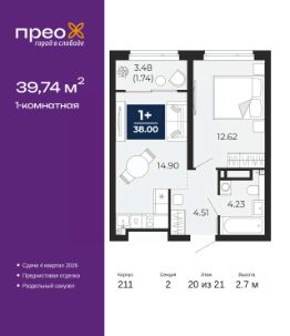 Успейте забронировать на этих условиях, срок предложения ограничен! Стоимость квартиры указана со скидкой, ваша экономия составит 300,450 руб. По всем вопросам обращайтесь в офис продаж, наши менеджеры вам все расскажут. 1-комн. квартира с предчистовой отделкой в ЖК ''Прео'' на 20 этаже. Общая площадь: 39.74 кв.м. Высота потолков 2.7 м. Дом монолитный, черырехподъездный, переменной этажности, от 14 до 21 этажей. Квартира находится во 2-й секции высотой 21 этаж в корпусе 211. На этаже 10 квартир. В подъезде 1 пассажирский и 1 грузовой лифт. Окончание строительства - 4 квартал 2026 года. Оформление сделки по договору долевого участия. Преображенский — один из самых привлекательных районов для жизни! Это полностью самостоятельный жилой район с точки зрения инфраструктуры. Преображенский находится между Московским и Червишевским трактами в квартале улиц Закалужская — Вьюжная — Александра Протозанова. Не нужно ждать, когда появится инфраструктура — переезжайте на всё готовое. Вблизи расположены действующие школа и детский сад. В этом году откроется еще один сад, а в следующем году — школа. По соседству с Преображенским запланировано строительство городского парка ''Комарово'' площадью 38 гектар. За 10 минут можно доехать на автомобиле до крупных ТРЦ: ''Лента'', ''Кристалл'', ''Леруа Мерлен'', ''Метро'' и ''Ашан''. С 2018 года в районе открыт Соседский центр — пространство, созданное для формирования добрососедской среды, совместного досуга, общения и реализации соседских инициатив. Здесь проходят встречи соседей, а также сами жители района организовывают мероприятия. Организатором такого события может стать любой желающий. В квартирах выполнена качественная предчистовая отделка. Гладкие стены с финишным выравниванием по маякам. Ровный потолок для установки натяжного потолка. Установлены пятикамерные окна с двойным стеклопакетом (3 стекла). Дизайнерские холлы с видеонаблюдением, безбарьерным и прозрачным входом всегда светло и спокойно. На первом этаже есть просторные колясочные, где все жители могут оставлять свои коляски и велосипеды. В Преображенском есть всё, что нужно для активного отдыха и занятий спортом. Мы сделали большое футбольное поле с безопасным покрытием. Также установили хоккейный корт, который оборудован по всем необходимым стандартам. Во дворах можно делать упражнения на специальных площадках с турниками. Весь район мы обустроили велодорожками, которые связаны в единый маршрут. У нас есть сухие фонтаны, бьющие из земли, деревья, веревки, сетки, скалодром, газон, песок и резинка — осталось просто дать своему ребенку право на свободную игру. По-настоящему хорошие дворы — это те, которые дети предпочитают соцсетям и телевизору. Аккредитация в банках: ОАО ''Альфа-Банк'', ''Сбербанк России'', ПАО ''Банк Уралсиб'', ПАО Банк ''ВТБ'', ПАО ''Газпромбанк'' и других. #2mDDd5