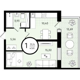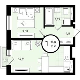 Однокомнатная квартира с мастер-спальней, оборудованной личной гардеробной. Из кухни можно выйти на балкон, выпить кофе и насладиться видом на променад. Санузел совмещенный. В прихожей есть ниша под шкаф с верхней одеждой.