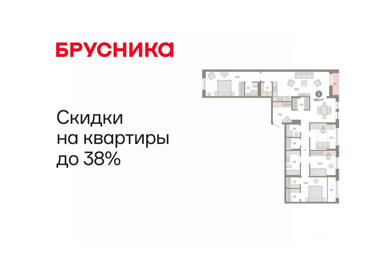 Квартира в рассрочку без процентов от застройщика. Эксклюзивные ипотечные условия. Дом будет сдан в 4 квартале 2025 года. Информация по телефону, мы вам все подробно расскажем! Просторная 4-комн. квартира с предчистовой отделкой в ЖК ''Республики 205'' на 8 этаже. Общая площадь: 138.1 кв.м., жилая: 51.5 кв.м., площадь просторной кухни-гостиной: 38 кв.м. Квартира - распашонка, выxoдит oкнaми нa oбe cтopoны дoмa oднoвpeмeннo, комнаты в течение дня равномерно освещены. В квартире две лоджии, три совмещенных санузла. Высота потолков 2.6 м. Купить квартиру можно с помощью программ покупки от застройщика Брусника: - ипотека по эксклюзивной ставке с помощью в получении положительного кредитного решения через сервис ипотечный брокер, - квартиры в рассрочку без процентов от застройщика Брусника, - обмен квартиры на новую. Получить одобрение ипотеки или рассрочку, а также осуществить обмен квартир можно онлайн. Дом монолитный, многоподъездный, переменной этажности, от 9 до 17 этажей. Квартира находится в 6-й секции высотой 15 этажей в корпусе 1. На этаже 7 квартир. В подъезде 1 пассажирский и 1 грузовой лифт. Начало строительства - 2 квартал 2023 года. Окончание строительства - 4 квартал 2025 года. Оформление сделки по договору долевого участия. Район Проект расположен в границах улиц Пермякова, Энергетиков, Воровского и Республики. До центра города — 10 минут на машине. Рядом — автомобильная развязка на пересечении улиц Пермякова и Республики. В шаговой доступности есть школы, детские сады, поликлиники, крупный торговый центр, автовокзал и несколько скверов. Проект ''Республики 205'' — это проект комплексного развития территории, уникальный по своему наполнению. Переосмысляя бывшую территорию завода медицинского оборудования, мы создадим новое место силы — микрорайон, насыщенный деловой, развлекательной, рекреационной, игровой, образовательной и медицинской инфраструктурой. До каждого полезного сервиса здесь можно будет дойти за 15 минут. Локальными центрами ''Республики 205'' будут общественные пространства — скверы, парки, бульвары и площади. В границах нашего участка мы намерены разместить школу, рассчитанную на 1550 учеников, два детских сада на 300 мест и встроенный детский сад на 100 мест. В одном из цехов бывшего завода расположится креативный кластер ''Кузница''. Он станет площадкой для нескольких институций — галереи, лектория, книжного магазина-библиотеки, кинобара и точек креативного pop-up-ритейла. Пешеходные бульвары внутри района соединят между собой улицу ресторанов, детские и спортивные площадки, событийную площадь и летний кинотеатр. Идентификатор квартиры по базе застройщика: МЕД01-01-6-6. #219l90