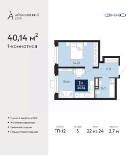 Торопитесь забронировать по акционной цене, предложение ограничено! Стоимость квартиры указана со скидкой, ваша экономия составит 417,500 руб. Информация по телефону, мы вам все подробно расскажем. Однокомнатная квартира от застройщика с предчистовой отделкой в ЖК ''Айвазовский City'' на 22 этаже. Общая площадь: 40.14 кв.м., жилая: 14.07 кв.м., площадь просторной кухни-столовой: 15.94 кв.м. Все окна выходят на одну сторону. В квартире один совмещенный санузел. Высота потолков 2.7 м. Дом монолитный, многоподъездный, высотой 24 этажа. Квартира находится в 3-й секции в корпусе ГП-12. На этаже 6 квартир. В подъезде 1 пассажирский и 1 грузовой лифт. Окончание строительства - 4 квартал 2028 года. Оформление сделки по договору долевого участия. Новый жилой район располагается в живописном месте на берегу Туры в центральной части города. Принципиально новое пространство для жизни в центре современного города для тех, чьи мечты сбываются, кто нацелен на постоянный рост, перемены к лучшему для себя и своих близких.Каждая деталь Айвазовский City вдохновляет и заряжает на новые свершения: авторская архитектура, сбалансированная продуманная инфраструктура, дизайнерские дворы со спортивными и детскими площадками, парковые зоны с фонтанами, водный канал, украшающий центральный прогулочный маршрут района и многое другое. В 2019 года проект стал лауреатом престижной премии Urban Awards 2019 в номинации ''Лучший строящийся региональный жилой комплекс бизнес-класса''. Главная особенность Айвазовский City - соседство разных архитектурных школ в рамках одного дома. Изысканная классика, выразительная эклектика и оригинальный модерн - жить в одном из таких домов настоящий повод для гордости. Айвазовский City это идеальное сочетание комфорта, технологий и развитой инфраструктуры. Вход в подъезд возможен с улицы и со двора. Отправляясь на работу или за покупками, жители могут выйти с внешней стороны дома, а для прогулки с ребенком со стороны двора. Экологически чистые материалы и энергосберегающие технологии, качественное освещение общественных зон, видеонаблюдение по всей территории жилого района (в том числе в подъездах, лифтах и в подземном паркинге), закрытые дворы с доступом только для жителей Айвазовский City. Часть домов в Айвазовский City будут оснащены подземным паркингом. Востребованный в нашем климатическом поясе формат хранения автомобилей защитит собственность владельца в любое время года. Аккредитация в банках: ОАО ''Альфа-Банк'', ПАО Банк ''ВТБ'', ПАО ''Газпромбанк'', ''Сбербанк России'', ПАО АКБ ''Абсолют Банк'' и других. #26EzA2