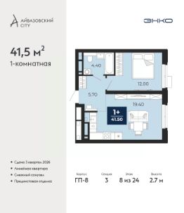 Успейте забронировать, пока действует скидка, период акции ограничен! Стоимость квартиры указана со скидкой, ваша экономия составит 417,500 руб. Звоните, наши менеджеры вам все расскажут. Продается 1-комн. квартира с предчистовой отделкой в ЖК ''Айвазовский City'' на 3 этаже. Общая площадь: 41.5 кв.м., жилая: 12 кв.м., площадь просторной кухни-столовой: 19.4 кв.м. Все окна выходят на одну сторону. В квартире один совмещенный санузел. Высота потолков 2.7 м. Дом монолитный, многоподъездный, переменной этажности, от 14 до 24 этажей. Квартира находится в 3-й секции высотой 24 этажа в корпусе ГП-8. На этаже 7 квартир. В подъезде 1 пассажирский и 1 грузовой лифт. Окончание строительства - 3 квартал 2026 года. Оформление сделки по договору долевого участия. Новый жилой район располагается в живописном месте на берегу Туры в центральной части города. Принципиально новое пространство для жизни в центре современного города для тех, чьи мечты сбываются, кто нацелен на постоянный рост, перемены к лучшему для себя и своих близких.Каждая деталь Айвазовский City вдохновляет и заряжает на новые свершения: авторская архитектура, сбалансированная продуманная инфраструктура, дизайнерские дворы со спортивными и детскими площадками, парковые зоны с фонтанами, водный канал, украшающий центральный прогулочный маршрут района и многое другое. В 2019 года проект стал лауреатом престижной премии Urban Awards 2019 в номинации ''Лучший строящийся региональный жилой комплекс бизнес-класса''. Главная особенность Айвазовский City - соседство разных архитектурных школ в рамках одного дома. Изысканная классика, выразительная эклектика и оригинальный модерн - жить в одном из таких домов настоящий повод для гордости. Айвазовский City это идеальное сочетание комфорта, технологий и развитой инфраструктуры. Вход в подъезд возможен с улицы и со двора. Отправляясь на работу или за покупками, жители могут выйти с внешней стороны дома, а для прогулки с ребенком со стороны двора. Экологически чистые материалы и энергосберегающие технологии, качественное освещение общественных зон, видеонаблюдение по всей территории жилого района (в том числе в подъездах, лифтах и в подземном паркинге), закрытые дворы с доступом только для жителей Айвазовский City. Часть домов в Айвазовский City будут оснащены подземным паркингом. Востребованный в нашем климатическом поясе формат хранения автомобилей защитит собственность владельца в любое время года. Аккредитация в банках: ПАО Банк ''ВТБ'', ''Сбербанк России'', ПАО ''Газпромбанк'', ОАО ''Альфа-Банк'', ПАО ''Совкомбанк'' и других. #ZMEZaB