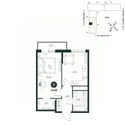 Классическая однокомнатная квартира с мастер-спальней, оборудованной гардеробной и выходом на французский балкон. В прихожей есть ниша под шкаф. Санузел совмещенный. Окна выходят на променад.