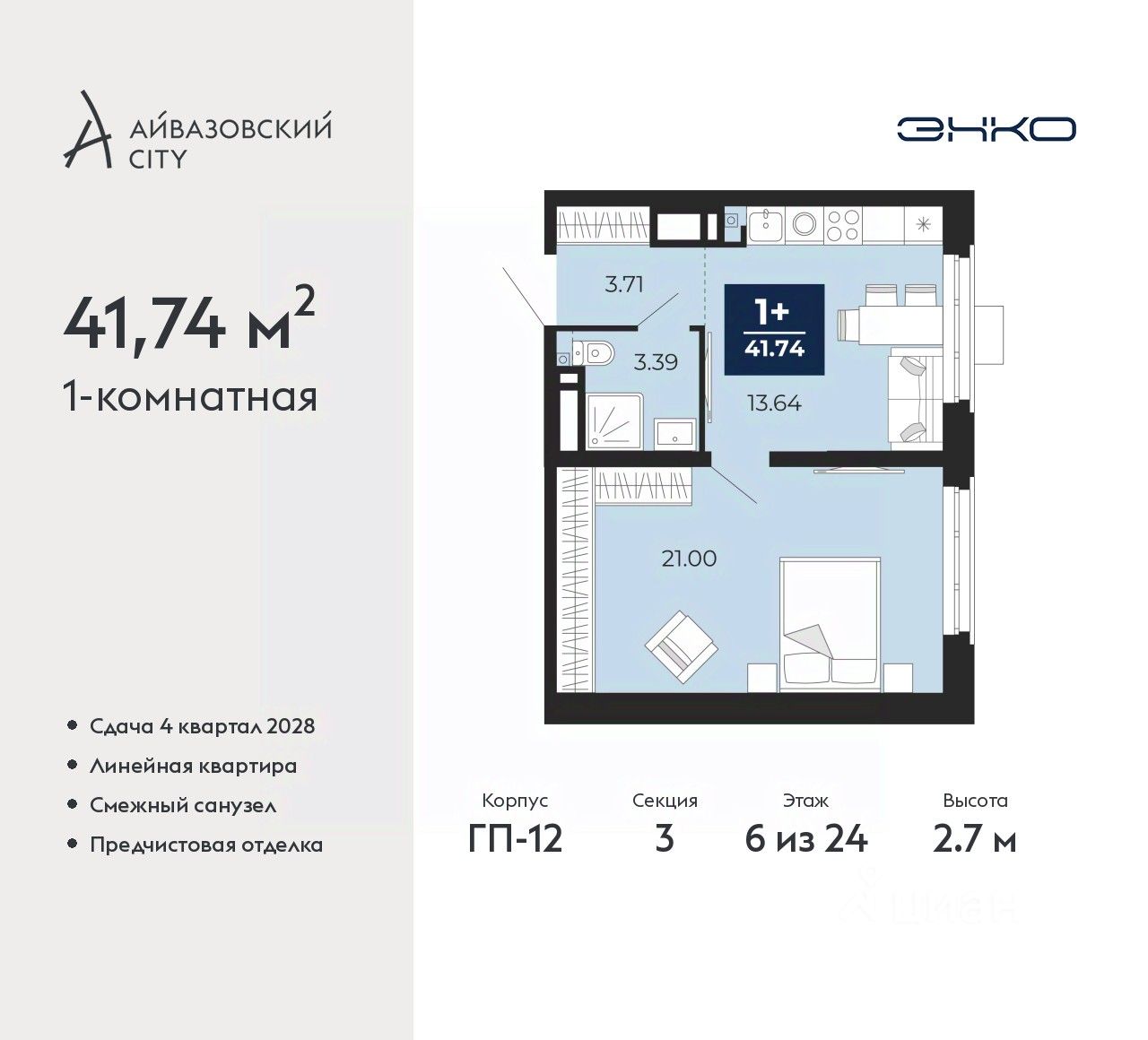 1-комн. квартира с предчистовой отделкой в ЖК ''Айвазовский City'' на 6 этаже. Общая площадь: 41.74 кв.м., жилая: 21 кв.м., площадь просторной кухни-столовой: 13.64 кв.м. Все окна выходят на одну сторону. В квартире один совмещенный санузел. Высота потолков 2.7 м. Дом монолитный, многоподъездный, высотой 24 этажа. Квартира находится в 3-й секции в корпусе ГП-12. На этаже 6 квартир. В подъезде 1 пассажирский и 1 грузовой лифт. Окончание строительства - 4 квартал 2028 года. Оформление сделки по договору долевого участия. Новый жилой район располагается в живописном месте на берегу Туры в центральной части города. Принципиально новое пространство для жизни в центре современного города для тех, чьи мечты сбываются, кто нацелен на постоянный рост, перемены к лучшему для себя и своих близких. Каждая деталь Айвазовский City вдохновляет и заряжает на новые свершения: авторская архитектура, сбалансированная продуманная инфраструктура, дизайнерские дворы со спортивными и детскими площадками, парковые зоны с фонтанами, водный канал, украшающий центральный прогулочный маршрут района и многое другое. В 2019 года проект стал лауреатом престижной премии Urban Awards 2019 в номинации ''Лучший строящийся региональный жилой комплекс бизнес-класса''. Главная особенность Айвазовский City - соседство разных архитектурных школ в рамках одного дома. Изысканная классика, выразительная эклектика и оригинальный модерн - жить в одном из таких домов настоящий повод для гордости. Айвазовский City это идеальное сочетание комфорта, технологий и развитой инфраструктуры. Вход в подъезд возможен с улицы и со двора. Отправляясь на работу или за покупками, жители могут выйти с внешней стороны дома, а для прогулки с ребенком со стороны двора. Экологически чистые материалы и энергосберегающие технологии, качественное освещение общественных зон, видеонаблюдение по всей территории жилого района (в том числе в подъездах, лифтах и в подземном паркинге), закрытые дворы с доступом только для жителей Айвазовский City. Часть домов в Айвазовский City будут оснащены подземным паркингом. Востребованный в нашем климатическом поясе формат хранения автомобилей защитит собственность владельца в любое время года. Аккредитация в банках: ПАО Банк ''ВТБ'', ''Сбербанк России'', ПАО ''Газпромбанк'', ОАО ''Альфа-Банк'', АО ''ДОМ.РФ'' и других. #Z6Vgm1