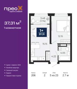 Успейте забронировать на этих условиях! Срок акции ограничен! Стоимость квартиры указана со скидкой, ваша экономия составит 343,053 RUB. Звоните, мы вам все подробно расскажем! Просторная 1-комн. квартира с предчистовой отделкой в ЖК ''Прео'' на 5 этаже. Общая площадь: 37.31 кв.м., жилая: 12.15 кв.м., площадь просторной кухни-столовой: 15.15 кв.м. Все окна выходят на одну сторону. В квартире одна лоджия, один совмещенный санузел. Высота потолков 2.7 м. Дом монолитный, трехподъездный, переменной этажности, от 14 до 23 этажей. Квартира находится во 2-й секции высотой 23 этажа в корпусе 206. На этаже 10 квартир. В подъезде 1 пассажирский и 1 грузовой лифт. Окончание строительства - 1 квартал 2026 года. Оформление сделки по договору долевого участия. Преображенский — один из самых привлекательных районов для жизни! Это полностью самостоятельный жилой район с точки зрения инфраструктуры. Преображенский находится между Московским и Червишевским трактами в квартале улиц Закалужская — Вьюжная — Александра Протозанова. Не нужно ждать, когда появится инфраструктура — переезжайте на всё готовое. Вблизи расположены действующие школа и детский сад. В этом году откроется еще один сад, а в следующем году — школа. По соседству с Преображенским запланировано строительство городского парка ''Комарово'' площадью 38 гектар. За 10 минут можно доехать на автомобиле до крупных ТРЦ: ''Лента'', ''Кристалл'', ''Леруа Мерлен'', ''Метро'' и ''Ашан''. С 2018 года в районе открыт Соседский центр — пространство, созданное для формирования добрососедской среды, совместного досуга, общения и реализации соседских инициатив. Здесь проходят встречи соседей, а также сами жители района организовывают мероприятия. Организатором такого события может стать любой желающий. В квартирах выполнена качественная предчистовая отделка. Гладкие стены с финишным выравниванием по маякам. Ровный потолок для установки натяжного потолка. Установлены пятикамерные окна с двойным стеклопакетом (3 стекла). Дизайнерские холлы с видеонаблюдением, безбарьерным и прозрачным входом всегда светло и спокойно. На первом этаже есть просторные колясочные, где все жители могут оставлять свои коляски и велосипеды. В Преображенском есть всё, что нужно для активного отдыха и занятий спортом. Мы сделали большое футбольное поле с безопасным покрытием. Также установили хоккейный корт, который оборудован по всем необходимым стандартам. Во дворах можно делать упражнения на специальных площадках с турниками. Весь район мы обустроили велодорожками, которые связаны в единый маршрут. У нас есть сухие фонтаны, бьющие из земли, деревья, веревки, сетки, скалодром, газон, песок и резинка — осталось просто дать своему ребенку право на свободную игру. По-настоящему хорошие дворы — это те, которые дети предпочитают соцсетям и телевизору. Аккредитация в банках: ''Сбербанк России'', ПАО ''Газпромбанк'', ПАО ''Банк Уралсиб'', ПАО Банк ''ВТБ'', ОАО ''Альфа-Банк'' и других. #ZmA29f