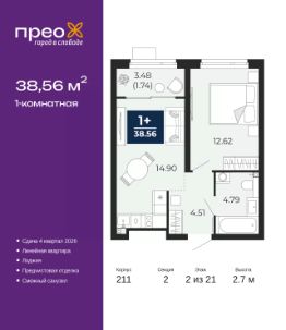 Спешите забронировать по акционной цене! Предложение ограничено! Стоимость квартиры указана со скидкой, ваша экономия составит 303,300 RUB. Информация по телефону, мы вам все подробно расскажем! Продается 1-комн. квартира с предчистовой отделкой в ЖК ''Прео'' на 2 этаже. Общая площадь: 38.56 кв.м., жилая: 12.62 кв.м., площадь просторной кухни-столовой: 14.9 кв.м. Все окна выходят на одну сторону. В квартире одна лоджия, один совмещенный санузел. Высота потолков 2.7 м. Дом монолитный, черырехподъездный, переменной этажности, от 14 до 21 этажей. Квартира находится во 2-й секции высотой 21 этаж в корпусе 211. На этаже 10 квартир. В подъезде 1 пассажирский и 1 грузовой лифт. Окончание строительства - 4 квартал 2026 года. Оформление сделки по договору долевого участия. Преображенский — один из самых привлекательных районов для жизни! Это полностью самостоятельный жилой район с точки зрения инфраструктуры. Преображенский находится между Московским и Червишевским трактами в квартале улиц Закалужская — Вьюжная — Александра Протозанова. Не нужно ждать, когда появится инфраструктура — переезжайте на всё готовое. Вблизи расположены действующие школа и детский сад. В этом году откроется еще один сад, а в следующем году — школа. По соседству с Преображенским запланировано строительство городского парка ''Комарово'' площадью 38 гектар. За 10 минут можно доехать на автомобиле до крупных ТРЦ: ''Лента'', ''Кристалл'', ''Леруа Мерлен'', ''Метро'' и ''Ашан''. С 2018 года в районе открыт Соседский центр — пространство, созданное для формирования добрососедской среды, совместного досуга, общения и реализации соседских инициатив. Здесь проходят встречи соседей, а также сами жители района организовывают мероприятия. Организатором такого события может стать любой желающий. В квартирах выполнена качественная предчистовая отделка. Гладкие стены с финишным выравниванием по маякам. Ровный потолок для установки натяжного потолка. Установлены пятикамерные окна с двойным стеклопакетом (3 стекла). Дизайнерские холлы с видеонаблюдением, безбарьерным и прозрачным входом всегда светло и спокойно. На первом этаже есть просторные колясочные, где все жители могут оставлять свои коляски и велосипеды. В Преображенском есть всё, что нужно для активного отдыха и занятий спортом. Мы сделали большое футбольное поле с безопасным покрытием. Также установили хоккейный корт, который оборудован по всем необходимым стандартам. Во дворах можно делать упражнения на специальных площадках с турниками. Весь район мы обустроили велодорожками, которые связаны в единый маршрут. У нас есть сухие фонтаны, бьющие из земли, деревья, веревки, сетки, скалодром, газон, песок и резинка — осталось просто дать своему ребенку право на свободную игру. По-настоящему хорошие дворы — это те, которые дети предпочитают соцсетям и телевизору. Аккредитация в банках: ОАО ''Альфа-Банк'', ''Сбербанк России'', ПАО ''Газпромбанк'', ПАО ''Банк Уралсиб'', ПАО Банк ''ВТБ'' и других. #zSoAMe