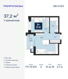 Спешите оформить бронирование на этих условиях! Срок акции ограничен! Стоимость квартиры указана со скидкой, ваша экономия составит 323,791 RUB. Информация по телефону, мы вам все подробно расскажем! Просторная 1-комн. квартира с предчистовой отделкой в ЖК ''Мириады'' на 13 этаже. Общая площадь: 37.2 кв.м., жилая: 11.3 кв.м., площадь просторной кухни-столовой: 15.3 кв.м. Все окна выходят на одну сторону. В квартире одна лоджия, один совмещенный санузел. Высота потолков 2.7 м. Дом монолитный, трехподъездный, переменной этажности, от 14 до 16 этажей. Квартира находится во 2-й секции высотой 16 этажей в корпусе ГП-72.103. На этаже 6 квартир. В подъезде 1 пассажирский и 1 грузовой лифт. В настоящее время строительство завершено, дом сдан в 4 квартале 2025 года. Оформление сделки по договору купли-продажи. Вселенная бесконечных историй. Ранее невиданный Тюмени масштаб: территория 240 гектаров и 1 650 000 м² застройки. Мириады это город масштабных перемен и больших возможностей. Город зеленых рощ и зеркальных озер. Город для работы, учебы и развлечений. Город для детей и их родителей. Город для всех и каждого. Проект расположен в районе Мыс рядом с ТРЦ ''Тюмень Сити Молл'' в границах улицы Тимофея Чаркова, Тобольского тракта и объездной дороги. Срок полного освоения территории - до 2034 года. #ZmTdbf