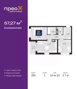 Успейте оформить бронирование по этой цене, срок предложения ограничен! Стоимость квартиры указана со скидкой, ваша экономия составит 435,109 руб. По всем вопросам обращайтесь в офис продаж, мы вам все подробно расскажем. Просторная двухкомнатная квартира с предчистовой отделкой в ЖК ''Прео'' на 13 этаже. Общая площадь: 57.27 кв.м. Высота потолков 2.7 м. Дом монолитный, трехподъездный, переменной этажности, от 14 до 23 этажей. Квартира находится в 1-й секции высотой 23 этажа в корпусе 206. На этаже 8 квартир. В подъезде 1 пассажирский и 1 грузовой лифт. Окончание строительства - 1 квартал 2026 года. Оформление сделки по договору долевого участия. Преображенский — один из самых привлекательных районов для жизни! Это полностью самостоятельный жилой район с точки зрения инфраструктуры. Преображенский находится между Московским и Червишевским трактами в квартале улиц Закалужская — Вьюжная — Александра Протозанова. Не нужно ждать, когда появится инфраструктура — переезжайте на всё готовое. Вблизи расположены действующие школа и детский сад. В этом году откроется еще один сад, а в следующем году — школа. По соседству с Преображенским запланировано строительство городского парка ''Комарово'' площадью 38 гектар. За 10 минут можно доехать на автомобиле до крупных ТРЦ: ''Лента'', ''Кристалл'', ''Леруа Мерлен'', ''Метро'' и ''Ашан''. С 2018 года в районе открыт Соседский центр — пространство, созданное для формирования добрососедской среды, совместного досуга, общения и реализации соседских инициатив. Здесь проходят встречи соседей, а также сами жители района организовывают мероприятия. Организатором такого события может стать любой желающий. В квартирах выполнена качественная предчистовая отделка. Гладкие стены с финишным выравниванием по маякам. Ровный потолок для установки натяжного потолка. Установлены пятикамерные окна с двойным стеклопакетом (3 стекла). Дизайнерские холлы с видеонаблюдением, безбарьерным и прозрачным входом всегда светло и спокойно. На первом этаже есть просторные колясочные, где все жители могут оставлять свои коляски и велосипеды. В Преображенском есть всё, что нужно для активного отдыха и занятий спортом. Мы сделали большое футбольное поле с безопасным покрытием. Также установили хоккейный корт, который оборудован по всем необходимым стандартам. Во дворах можно делать упражнения на специальных площадках с турниками. Весь район мы обустроили велодорожками, которые связаны в единый маршрут. У нас есть сухие фонтаны, бьющие из земли, деревья, веревки, сетки, скалодром, газон, песок и резинка — осталось просто дать своему ребенку право на свободную игру. По-настоящему хорошие дворы — это те, которые дети предпочитают соцсетям и телевизору. Аккредитация в банках: ''Сбербанк России'', ПАО Банк ''ВТБ'', ПАО ''Газпромбанк'', ОАО ''Альфа-Банк'', ПАО ''Банк Уралсиб'' и других. #2Me0M7