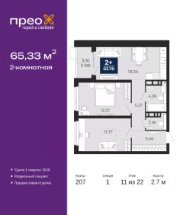 Торопитесь оформить бронирование, пока действует скидка, предложение ограничено! Стоимость квартиры указана со скидкой, ваша экономия составит 447,299 руб. Звоните, наши менеджеры вам все расскажут. 2-комн. квартира с предчистовой отделкой в ЖК ''Прео'' на 11 этаже. Общая площадь: 65.33 кв.м. Высота потолков 2.7 м. Дом монолитный, двухподъездный, высотой 22 этажа. Квартира находится в 1-й секции в корпусе 207. На этаже 8 квартир. В подъезде 1 пассажирский и 1 грузовой лифт. Окончание строительства - 1 квартал 2026 года. Оформление сделки по договору долевого участия. Преображенский — один из самых привлекательных районов для жизни! Это полностью самостоятельный жилой район с точки зрения инфраструктуры. Преображенский находится между Московским и Червишевским трактами в квартале улиц Закалужская — Вьюжная — Александра Протозанова. Не нужно ждать, когда появится инфраструктура — переезжайте на всё готовое. Вблизи расположены действующие школа и детский сад. В этом году откроется еще один сад, а в следующем году — школа. По соседству с Преображенским запланировано строительство городского парка ''Комарово'' площадью 38 гектар. За 10 минут можно доехать на автомобиле до крупных ТРЦ: ''Лента'', ''Кристалл'', ''Леруа Мерлен'', ''Метро'' и ''Ашан''. С 2018 года в районе открыт Соседский центр — пространство, созданное для формирования добрососедской среды, совместного досуга, общения и реализации соседских инициатив. Здесь проходят встречи соседей, а также сами жители района организовывают мероприятия. Организатором такого события может стать любой желающий. В квартирах выполнена качественная предчистовая отделка. Гладкие стены с финишным выравниванием по маякам. Ровный потолок для установки натяжного потолка. Установлены пятикамерные окна с двойным стеклопакетом (3 стекла). Дизайнерские холлы с видеонаблюдением, безбарьерным и прозрачным входом всегда светло и спокойно. На первом этаже есть просторные колясочные, где все жители могут оставлять свои коляски и велосипеды. В Преображенском есть всё, что нужно для активного отдыха и занятий спортом. Мы сделали большое футбольное поле с безопасным покрытием. Также установили хоккейный корт, который оборудован по всем необходимым стандартам. Во дворах можно делать упражнения на специальных площадках с турниками. Весь район мы обустроили велодорожками, которые связаны в единый маршрут. У нас есть сухие фонтаны, бьющие из земли, деревья, веревки, сетки, скалодром, газон, песок и резинка — осталось просто дать своему ребенку право на свободную игру. По-настоящему хорошие дворы — это те, которые дети предпочитают соцсетям и телевизору. Аккредитация в банках: ''Сбербанк России'', ПАО ''Газпромбанк'', ПАО ''Банк Уралсиб'', ПАО Банк ''ВТБ'', ОАО ''Альфа-Банк'' и других. #2mEOca
