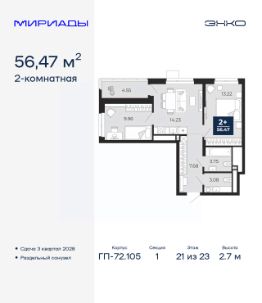 Торопитесь оформить бронирование по этой цене, период предложения ограничен! Стоимость квартиры указана со скидкой, ваша экономия составит 390,000 руб. Звоните, мы вам все подробно расскажем. 2-комн. квартира от застройщика в ЖК ''Мириады'' на 21 этаже. Общая площадь: 56.47 кв.м. Высота потолков 2.7 м. Квартира находится в корпусе ГП-72.105. Дом монолитный, одноподъездный, высотой 23 этажа. На этаже 8 квартир. В подъезде 2 пассажирских и 1 грузовой лифт. Начало строительства - 1 квартал 2026 года. Окончание строительства - 3 квартал 2028 года. Оформление сделки по договору долевого участия. Вселенная бесконечных историй. Ранее невиданный Тюмени масштаб: территория 240 гектаров и 1 650 000 м² застройки. Мириады это город масштабных перемен и больших возможностей. Город зеленых рощ и зеркальных озер. Город для работы, учебы и развлечений. Город для детей и их родителей. Город для всех и каждого. Проект расположен в районе Мыс рядом с ТРЦ ''Тюмень Сити Молл'' в границах улицы Тимофея Чаркова, Тобольского тракта и объездной дороги. Срок полного освоения территории - до 2034 года. #26DfaI