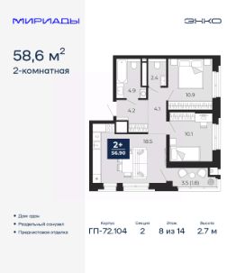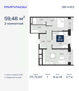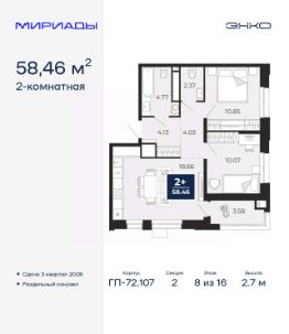 Спешите оформить бронирование по акционной цене, срок акции ограничен! Стоимость квартиры указана со скидкой, ваша экономия составит 385,000 руб. Звоните, наши менеджеры вам все расскажут. 2-комн. квартира от застройщика в ЖК ''Мириады'' на 8 этаже. Общая площадь: 58.46 кв.м. Высота потолков 2.7 м. Дом монолитный, двухподъездный, переменной этажности, от 14 до 16 этажей. Квартира находится во 2-й секции высотой 16 этажей в корпусе ГП-72.107. На этаже 10 квартир. В подъезде 1 пассажирский и 1 грузовой лифт. Окончание строительства - 3 квартал 2028 года. Оформление сделки по договору долевого участия. Вселенная бесконечных историй. Ранее невиданный Тюмени масштаб: территория 240 гектаров и 1 650 000 м² застройки. Мириады это город масштабных перемен и больших возможностей. Город зеленых рощ и зеркальных озер. Город для работы, учебы и развлечений. Город для детей и их родителей. Город для всех и каждого. Проект расположен в районе Мыс рядом с ТРЦ ''Тюмень Сити Молл'' в границах улицы Тимофея Чаркова, Тобольского тракта и объездной дороги. Срок полного освоения территории - до 2034 года. #2Mdf94