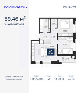 Успейте оформить бронирование на этих условиях, предложение ограничено! Стоимость квартиры указана со скидкой, ваша экономия составит 386,500 руб. Звоните, мы вам все подробно расскажем. Продается двухкомнатная квартира в ЖК ''Мириады'' на 13 этаже. Общая площадь: 58.46 кв.м. Высота потолков 2.7 м. Дом монолитный, двухподъездный, переменной этажности, от 14 до 16 этажей. Квартира находится во 2-й секции высотой 16 этажей в корпусе ГП-72.107. На этаже 10 квартир. В подъезде 1 пассажирский и 1 грузовой лифт. Окончание строительства - 3 квартал 2028 года. Оформление сделки по договору долевого участия. Вселенная бесконечных историй. Ранее невиданный Тюмени масштаб: территория 240 гектаров и 1 650 000 м² застройки. Мириады это город масштабных перемен и больших возможностей. Город зеленых рощ и зеркальных озер. Город для работы, учебы и развлечений. Город для детей и их родителей. Город для всех и каждого. Проект расположен в районе Мыс рядом с ТРЦ ''Тюмень Сити Молл'' в границах улицы Тимофея Чаркова, Тобольского тракта и объездной дороги. Срок полного освоения территории - до 2034 года. #ZmdFgt