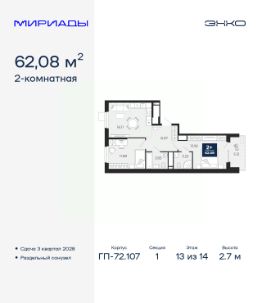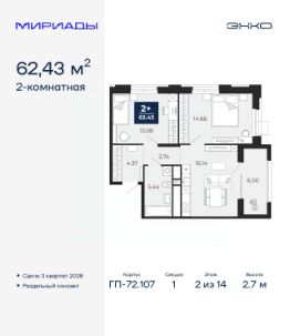 Успейте оформить бронирование по этой цене, предложение ограничено! Стоимость квартиры указана со скидкой, ваша экономия составит 404,000 руб. По всем вопросам звоните в офис продаж, мы вам все подробно расскажем. Продается 2-комн. квартира от застройщика в ЖК ''Мириады'' на 13 этаже. Общая площадь: 62.08 кв.м. Высота потолков 2.7 м. Дом монолитный, двухподъездный, переменной этажности, от 14 до 16 этажей. Квартира находится в 1-й секции высотой 14 этажей в корпусе ГП-72.107. На этаже 5 квартир. В подъезде 1 пассажирский и 1 грузовой лифт. Окончание строительства - 3 квартал 2028 года. Оформление сделки по договору долевого участия. Вселенная бесконечных историй. Ранее невиданный Тюмени масштаб: территория 240 гектаров и 1 650 000 м² застройки. Мириады это город масштабных перемен и больших возможностей. Город зеленых рощ и зеркальных озер. Город для работы, учебы и развлечений. Город для детей и их родителей. Город для всех и каждого. Проект расположен в районе Мыс рядом с ТРЦ ''Тюмень Сити Молл'' в границах улицы Тимофея Чаркова, Тобольского тракта и объездной дороги. Срок полного освоения территории - до 2034 года. #zmdfCv