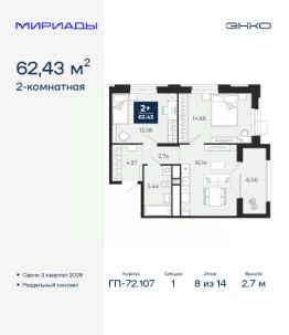 Успейте забронировать по акционной цене, предложение ограничено! Стоимость квартиры указана со скидкой, ваша экономия составит 402,500 руб. По всем вопросам обращайтесь в офис продаж, наши менеджеры вам все расскажут. 2-комн. квартира от застройщика в ЖК ''Мириады'' на 8 этаже. Общая площадь: 62.43 кв.м. Высота потолков 2.7 м. Дом монолитный, двухподъездный, переменной этажности, от 14 до 16 этажей. Квартира находится в 1-й секции высотой 14 этажей в корпусе ГП-72.107. На этаже 5 квартир. В подъезде 1 пассажирский и 1 грузовой лифт. Окончание строительства - 3 квартал 2028 года. Оформление сделки по договору долевого участия. Вселенная бесконечных историй. Ранее невиданный Тюмени масштаб: территория 240 гектаров и 1 650 000 м² застройки. Мириады это город масштабных перемен и больших возможностей. Город зеленых рощ и зеркальных озер. Город для работы, учебы и развлечений. Город для детей и их родителей. Город для всех и каждого. Проект расположен в районе Мыс рядом с ТРЦ ''Тюмень Сити Молл'' в границах улицы Тимофея Чаркова, Тобольского тракта и объездной дороги. Срок полного освоения территории - до 2034 года. #ZMDFC1