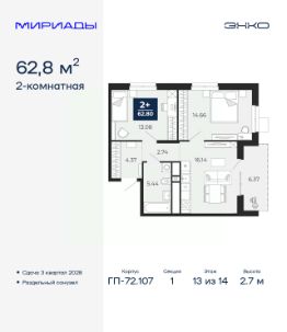 Спешите забронировать, пока действует скидка, срок акции ограничен! Стоимость квартиры указана со скидкой, ваша экономия составит 404,500 руб. Звоните, наши менеджеры вам все расскажут. Просторная 2-комн. квартира в ЖК ''Мириады'' на 13 этаже. Общая площадь: 62.8 кв.м. Высота потолков 2.7 м. Дом монолитный, двухподъездный, переменной этажности, от 14 до 16 этажей. Квартира находится в 1-й секции высотой 14 этажей в корпусе ГП-72.107. На этаже 5 квартир. В подъезде 1 пассажирский и 1 грузовой лифт. Окончание строительства - 3 квартал 2028 года. Оформление сделки по договору долевого участия. Вселенная бесконечных историй. Ранее невиданный Тюмени масштаб: территория 240 гектаров и 1 650 000 м² застройки. Мириады это город масштабных перемен и больших возможностей. Город зеленых рощ и зеркальных озер. Город для работы, учебы и развлечений. Город для детей и их родителей. Город для всех и каждого. Проект расположен в районе Мыс рядом с ТРЦ ''Тюмень Сити Молл'' в границах улицы Тимофея Чаркова, Тобольского тракта и объездной дороги. Срок полного освоения территории - до 2034 года. #26dFCD