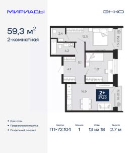 Торопитесь забронировать, пока действует скидка, срок акции ограничен! Стоимость квартиры указана со скидкой, ваша экономия составит 410,678 руб. По всем вопросам звоните в офис продаж, наши менеджеры вам все расскажут. Продается 2-комн. квартира с предчистовой отделкой в ЖК ''Мириады'' на 13 этаже. Общая площадь: 59.3 кв.м. Высота потолков 2.7 м. Дом монолитный, двухподъездный, переменной этажности, от 14 до 18 этажей. Квартира находится в 1-й секции высотой 18 этажей в корпусе ГП-72.104. На этаже 6 квартир. В подъезде 1 пассажирский и 1 грузовой лифт. На сегодняшний день строительство окончено, дом сдан в 4 квартале 2025 года. Оформление сделки по договору купли-продажи. Вселенная бесконечных историй. Ранее невиданный Тюмени масштаб: территория 240 гектаров и 1 650 000 м² застройки. Мириады это город масштабных перемен и больших возможностей. Город зеленых рощ и зеркальных озер. Город для работы, учебы и развлечений. Город для детей и их родителей. Город для всех и каждого. Проект расположен в районе Мыс рядом с ТРЦ ''Тюмень Сити Молл'' в границах улицы Тимофея Чаркова, Тобольского тракта и объездной дороги. Срок полного освоения территории - до 2034 года. #zmdfdF