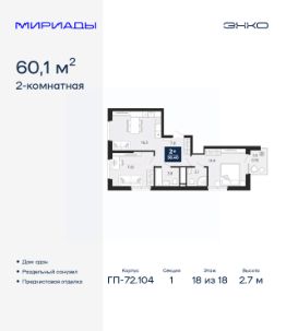 Спешите забронировать по этой цене, период предложения ограничен! Стоимость квартиры указана со скидкой, ваша экономия составит 457,828 руб. Звоните, наши менеджеры вам все расскажут. Двухкомнатная квартира с предчистовой отделкой в ЖК ''Мириады'' на 18 этаже. Общая площадь: 60.1 кв.м. Высота потолков 2.7 м. Дом монолитный, двухподъездный, переменной этажности, от 14 до 18 этажей. Квартира находится в 1-й секции высотой 18 этажей в корпусе ГП-72.104. На этаже 6 квартир. В подъезде 1 пассажирский и 1 грузовой лифт. Строительство окончено, дом сдан в 4 квартале 2025 года. Оформление сделки по договору купли-продажи. Вселенная бесконечных историй. Ранее невиданный Тюмени масштаб: территория 240 гектаров и 1 650 000 м² застройки. Мириады это город масштабных перемен и больших возможностей. Город зеленых рощ и зеркальных озер. Город для работы, учебы и развлечений. Город для детей и их родителей. Город для всех и каждого. Проект расположен в районе Мыс рядом с ТРЦ ''Тюмень Сити Молл'' в границах улицы Тимофея Чаркова, Тобольского тракта и объездной дороги. Срок полного освоения территории - до 2034 года. #zmeOFf