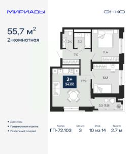 Успейте забронировать на этих условиях, срок акции ограничен! Стоимость квартиры указана со скидкой, ваша экономия составит 417,785 руб. Звоните, мы вам все подробно расскажем. Просторная двухкомнатная квартира с предчистовой отделкой в ЖК ''Мириады'' на 10 этаже. Общая площадь: 55.7 кв.м. Высота потолков 2.7 м. Дом монолитный, трехподъездный, переменной этажности, от 14 до 16 этажей. Квартира находится в 3-й секции высотой 14 этажей в корпусе ГП-72.103. На этаже 8 квартир. В подъезде 1 пассажирский и 1 грузовой лифт. Строительство окончено, дом сдан в 4 квартале 2025 года. Оформление сделки по договору купли-продажи. Вселенная бесконечных историй. Ранее невиданный Тюмени масштаб: территория 240 гектаров и 1 650 000 м² застройки. Мириады это город масштабных перемен и больших возможностей. Город зеленых рощ и зеркальных озер. Город для работы, учебы и развлечений. Город для детей и их родителей. Город для всех и каждого. Проект расположен в районе Мыс рядом с ТРЦ ''Тюмень Сити Молл'' в границах улицы Тимофея Чаркова, Тобольского тракта и объездной дороги. Срок полного освоения территории - до 2034 года. #Z6eoo1