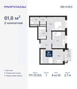 Торопитесь забронировать по акционной цене, предложение ограничено! Стоимость квартиры указана со скидкой, ваша экономия составит 437,460 руб. Информация по телефону, мы вам все подробно расскажем. 2-комн. квартира от застройщика с предчистовой отделкой в ЖК ''Мириады'' на 8 этаже. Общая площадь: 61.8 кв.м. Высота потолков 2.7 м. Дом монолитный, трехподъездный, переменной этажности, от 14 до 16 этажей. Квартира находится в 1-й секции высотой 16 этажей в корпусе ГП-72.103. На этаже 8 квартир. В подъезде 1 пассажирский и 1 грузовой лифт. Строительство завершено, дом сдан в 4 квартале 2025 года. Оформление сделки по договору купли-продажи. Вселенная бесконечных историй. Ранее невиданный Тюмени масштаб: территория 240 гектаров и 1 650 000 м² застройки. Мириады это город масштабных перемен и больших возможностей. Город зеленых рощ и зеркальных озер. Город для работы, учебы и развлечений. Город для детей и их родителей. Город для всех и каждого. Проект расположен в районе Мыс рядом с ТРЦ ''Тюмень Сити Молл'' в границах улицы Тимофея Чаркова, Тобольского тракта и объездной дороги. Срок полного освоения территории - до 2034 года. #zMEoTS
