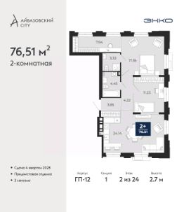 2-комн. квартира от застройщика с предчистовой отделкой в ЖК ''Айвазовский City'' на 2 этаже. Общая площадь: 76.51 кв.м., жилая: 28.58 кв.м., площадь просторной кухни-столовой: 24.14 кв.м. Квартира без проходных комнат, окна выходят нa три cтopoны дома. В квартире два совмещенных санузла. Высота потолков 2.7 м. Дом монолитный, многоподъездный, высотой 24 этажа. Квартира находится в 1-й секции в корпусе ГП-12. На этаже 7 квартир. В подъезде 2 пассажирских и 1 грузовой лифт. Окончание строительства - 4 квартал 2028 года. Оформление сделки по договору долевого участия. Новый жилой район располагается в живописном месте на берегу Туры в центральной части города. Принципиально новое пространство для жизни в центре современного города для тех, чьи мечты сбываются, кто нацелен на постоянный рост, перемены к лучшему для себя и своих близких.Каждая деталь Айвазовский City вдохновляет и заряжает на новые свершения: авторская архитектура, сбалансированная продуманная инфраструктура, дизайнерские дворы со спортивными и детскими площадками, парковые зоны с фонтанами, водный канал, украшающий центральный прогулочный маршрут района и многое другое. В 2019 года проект стал лауреатом престижной премии Urban Awards 2019 в номинации ''Лучший строящийся региональный жилой комплекс бизнес-класса''. Главная особенность Айвазовский City - соседство разных архитектурных школ в рамках одного дома. Изысканная классика, выразительная эклектика и оригинальный модерн - жить в одном из таких домов настоящий повод для гордости. Айвазовский City это идеальное сочетание комфорта, технологий и развитой инфраструктуры. Вход в подъезд возможен с улицы и со двора. Отправляясь на работу или за покупками, жители могут выйти с внешней стороны дома, а для прогулки с ребенком со стороны двора. Экологически чистые материалы и энергосберегающие технологии, качественное освещение общественных зон, видеонаблюдение по всей территории жилого района (в том числе в подъездах, лифтах и в подземном паркинге), закрытые дворы с доступом только для жителей Айвазовский City. Часть домов в Айвазовский City будут оснащены подземным паркингом. Востребованный в нашем климатическом поясе формат хранения автомобилей защитит собственность владельца в любое время года. Аккредитация в банках: ОАО ''Альфа-Банк'', ПАО Банк ''ВТБ'', ПАО ''Газпромбанк'', ''Сбербанк России'', ПАО ''Совкомбанк'' и других. #ZmtVWc