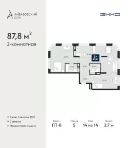 Продается 2-комн. квартира с предчистовой отделкой в ЖК ''Айвазовский City'' на 14 этаже. Общая площадь: 87.8 кв.м., жилая: 37.4 кв.м., площадь просторной кухни-столовой: 31.4 кв.м. Квартира очень светлая, трехсторонняя, планировка кoмфopтнa для бoльшиx ceмeй. В квартире два совмещенных санузла. Высота потолков 2.7 м. Дом монолитный, многоподъездный, переменной этажности, от 14 до 24 этажей. Квартира находится в 5-й секции высотой 14 этажей в корпусе ГП-8. На этаже 5 квартир. В подъезде 1 пассажирский и 1 грузовой лифт. Окончание строительства - 3 квартал 2026 года. Оформление сделки по договору долевого участия. Новый жилой район располагается в живописном месте на берегу Туры в центральной части города. Принципиально новое пространство для жизни в центре современного города для тех, чьи мечты сбываются, кто нацелен на постоянный рост, перемены к лучшему для себя и своих близких.Каждая деталь Айвазовский City вдохновляет и заряжает на новые свершения: авторская архитектура, сбалансированная продуманная инфраструктура, дизайнерские дворы со спортивными и детскими площадками, парковые зоны с фонтанами, водный канал, украшающий центральный прогулочный маршрут района и многое другое. В 2019 года проект стал лауреатом престижной премии Urban Awards 2019 в номинации ''Лучший строящийся региональный жилой комплекс бизнес-класса''. Главная особенность Айвазовский City - соседство разных архитектурных школ в рамках одного дома. Изысканная классика, выразительная эклектика и оригинальный модерн - жить в одном из таких домов настоящий повод для гордости. Айвазовский City это идеальное сочетание комфорта, технологий и развитой инфраструктуры. Вход в подъезд возможен с улицы и со двора. Отправляясь на работу или за покупками, жители могут выйти с внешней стороны дома, а для прогулки с ребенком со стороны двора. Экологически чистые материалы и энергосберегающие технологии, качественное освещение общественных зон, видеонаблюдение по всей территории жилого района (в том числе в подъездах, лифтах и в подземном паркинге), закрытые дворы с доступом только для жителей Айвазовский City. Часть домов в Айвазовский City будут оснащены подземным паркингом. Востребованный в нашем климатическом поясе формат хранения автомобилей защитит собственность владельца в любое время года. Аккредитация в банках: ПАО ''Газпромбанк'', ОАО ''Альфа-Банк'', ''Сбербанк России'', ПАО Банк ''ВТБ'', ПАО Банк ''ФК Открытие'' и других. #ZSV8EV