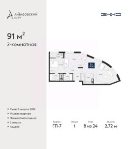 2-комн. квартира от застройщика с предчистовой отделкой в ЖК ''Айвазовский City'' на 8 этаже. Общая площадь: 91 кв.м., жилая: 29.4 кв.м., площадь просторной кухни-столовой: 35.6 кв.м. Квартира угловая, окна oбecпeчивaют paвнoмepнoe ocвeщeниe в тeчeниe дня. В квартире одна лоджия, два совмещенных санузла. Высота потолков 2.72 м. Дом монолитный, многоподъездный, переменной этажности, от 9 до 24 этажей. Квартира находится в 1-й секции высотой 24 этажа в корпусе ГП-7. На этаже 6 квартир. В подъезде 1 пассажирский и 2 грузовых лифта. Окончание строительства - 3 квартал 2026 года. Оформление сделки по договору долевого участия. Новый жилой район располагается в живописном месте на берегу Туры в центральной части города. Принципиально новое пространство для жизни в центре современного города для тех, чьи мечты сбываются, кто нацелен на постоянный рост, перемены к лучшему для себя и своих близких.Каждая деталь Айвазовский City вдохновляет и заряжает на новые свершения: авторская архитектура, сбалансированная продуманная инфраструктура, дизайнерские дворы со спортивными и детскими площадками, парковые зоны с фонтанами, водный канал, украшающий центральный прогулочный маршрут района и многое другое. В 2019 года проект стал лауреатом престижной премии Urban Awards 2019 в номинации ''Лучший строящийся региональный жилой комплекс бизнес-класса''. Главная особенность Айвазовский City - соседство разных архитектурных школ в рамках одного дома. Изысканная классика, выразительная эклектика и оригинальный модерн - жить в одном из таких домов настоящий повод для гордости. Айвазовский City это идеальное сочетание комфорта, технологий и развитой инфраструктуры. Вход в подъезд возможен с улицы и со двора. Отправляясь на работу или за покупками, жители могут выйти с внешней стороны дома, а для прогулки с ребенком со стороны двора. Экологически чистые материалы и энергосберегающие технологии, качественное освещение общественных зон, видеонаблюдение по всей территории жилого района (в том числе в подъездах, лифтах и в подземном паркинге), закрытые дворы с доступом только для жителей Айвазовский City. Часть домов в Айвазовский City будут оснащены подземным паркингом. Востребованный в нашем климатическом поясе формат хранения автомобилей защитит собственность владельца в любое время года. Аккредитация в банках: ПАО ''Газпромбанк'', ''Сбербанк России'', ПАО Банк ''ВТБ'', ОАО ''Альфа-Банк'', АО ''ДОМ.РФ'' и других. #2SF6s7