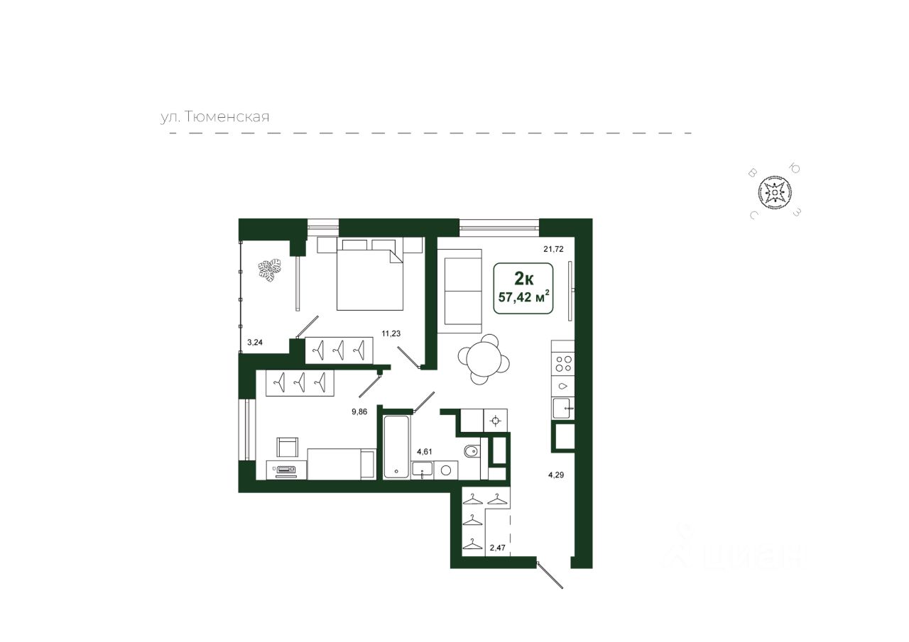 ЖК ''Свой'' — жилой комплекс для людей, которым важно чувство родного места и домашней атмосферы. Проект включает в себя 2 дома высотой 16 этажей. Здесь 360 квартир площадью от 34 до 74 м2. Срок сдачи 1 квартал 2028 год. ЖК расположен на пересечении улиц Ватутина, Щербакова и Чайковского — это тихий, спокойный район в Центральном округе Тюмени. Здесь развитая инфраструктура: поблизости несколько детских садов и школ, медицинские учреждения, крупные торговые центры, фитнес-клубы и парки для отдыха. В закрытых дворах: зоны для тихого отдыха, площадка для детей с лабиринтом, всесезонные деревья и кустарники. Шумные зоны вынесены за пределы двора. Здесь находится зона для воркаута и баскетбольная площадка, коворкинг-зоны, а также экран для просмотра фильмов. Для парковки автомобилей обустроено 323 машиноместа. В каждой парадной есть теплый тамбур и домофон с Face ID. В колясочных установлен пост для подкачки колёс и лапомойка для домашних питомцев. В проекте широкий выбор квартир: площадью от 34 до 74 м2, с мастер-спальнями, постирочными, просторными кухнями-гостиными, двумя санузлами, с окнами в ванной.