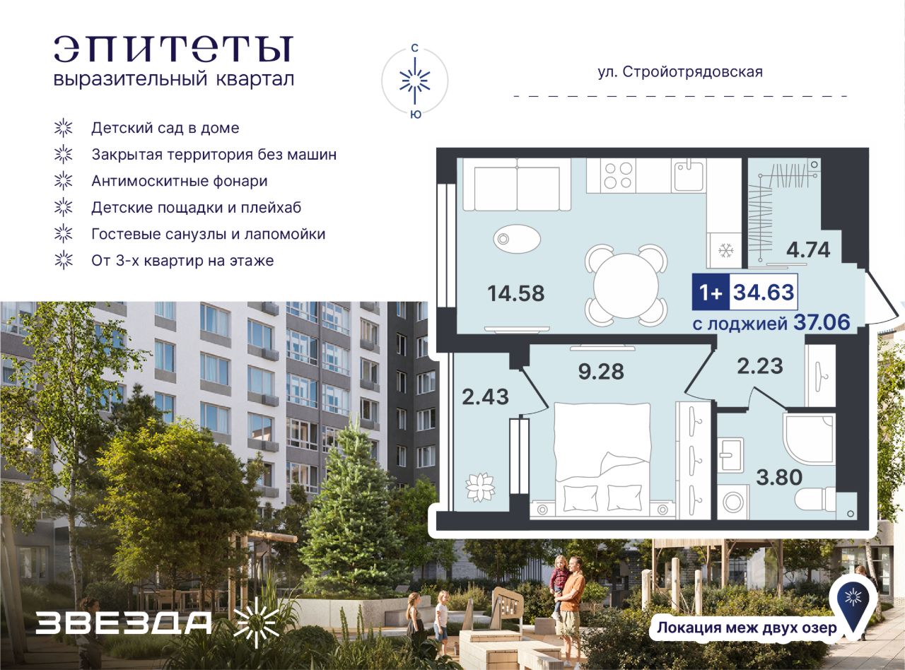 Новая квартира в ЖК ''Авторский'' напрямую от федерального застройщика ''Страна Девелопмент''.Продается 2комнатная квартира на 3 этаже от застройщика Страна Девелопмент. Площадь квартиры 34,06 кв. м.Жилой комплекс ''Авторский'' — квартал для авторов своей жизни от федерального застройщика ''Страна Девелопмент'' вблизи исторического центра — до Моста Влюблённых 4 минуты на авто, а ещё рядом ведущие вузы Тюмени.ПРЕИМУЩЕСТВА- Тематический бульвар объединяет дома и закрытые дворы квартала в единую экосистему: зелень, перголы для отдыха, детские и спортивные площадки. По вечерам бульвар преображается: освещение создаёт уютную атмосферу.- Новый детский сад рядом, который появится в 2026 году прямо в одном из корпусов комплекса. В нём выделено 150 мест для малышей.- Во дворах нет машин, шума, выхлопных газов и посторонних людей. Всё пространство разделено на зоны по интересам и возрастам. Для детей — игровые площадки из эко-материалов и мягкая защита от падений. Для взрослых — зоны отдыха, воркаут-площадки и тропинки для неспешных прогулок.ОТДЕЛКАКвартиры сдаются с предчистовой отделкой: произведена разводка электричества и отопления, выполнена стяжка пола, стены выровнены ''под маяк'', установлены розетки, выключатели и радиаторы. ДИЗАЙНЕРСКАЯ ОТДЕЛКАПри покупке квартиры в ЖК ''Авторский'' можно включить стоимость ремонта в ипотеку. Пять вариантов на выбор: хлопковая нить, серый шторм, белый камень, шалфей, голубой вереск. СПОСОБЫ ПОКУПКИСотрудники ''Страна Девелопмент'' будут сопровождать вас на каждом этапе сделки, помогут получить одобрение по ипотеке или снизить ежемесячный платеж.- ипотека- рассрочка- с использованием материнского капитала -100% оплата наличнымиЦены на квартиры указаны без учета скидок. На консультации менеджер подскажет, какие акции действуют, и как получить одобрение по ипотеке с низкой ставкой.
