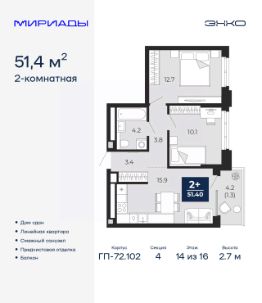 Успейте оформить бронирование по акционной цене! Период акции ограничен! Стоимость квартиры указана со скидкой, ваша экономия составит 404,283 RUB. Информация по телефону, мы вам все подробно расскажем! Продается 2-комн. квартира от застройщика с предчистовой отделкой в ЖК ''Мириады'' на 14 этаже. Общая площадь: 51.4 кв.м., жилая: 22.8 кв.м., площадь просторной кухни-столовой: 15.9 кв.м. Комнаты изолированные, все окна выходят на одну сторону. В квартире один балкон, один совмещенный санузел. Высота потолков 2.7 м. Дом монолитный, многоподъездный, переменной этажности, от 14 до 16 этажей. Квартира находится в 4-й секции высотой 16 этажей в корпусе ГП-72.102. На этаже 6 квартир. В подъезде 1 пассажирский и 1 грузовой лифт. Строительство завершено, дом сдан в 4 квартале 2025 года. Оформление сделки по договору купли-продажи. Вселенная бесконечных историй. Ранее невиданный Тюмени масштаб: территория 240 гектаров и 1 650 000 м² застройки. Мириады это город масштабных перемен и больших возможностей. Город зеленых рощ и зеркальных озер. Город для работы, учебы и развлечений. Город для детей и их родителей. Город для всех и каждого. Проект расположен в районе Мыс рядом с ТРЦ ''Тюмень Сити Молл'' в границах улицы Тимофея Чаркова, Тобольского тракта и объездной дороги. Срок полного освоения территории - до 2034 года. #zMb4mA