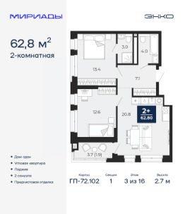 2-комн. квартира с предчистовой отделкой в ЖК ''Мотивы'' на 10 этаже. Общая площадь: 68.85 кв.м., жилая: 25.71 кв.м., площадь просторной кухни-столовой: 16.05 кв.м. Квартира - распашонка, без проходных комнат, окна выходят на paзные стороны дома. В квартире две лоджии, два совмещенных санузла. Высота потолков 2.7 м. Квартира будет сдаваться с предчистовой отделкой White Box: выровнены и оштукатурены стены, проведено электричество и отопление, установлены радиаторы. Вы также можете приобрести квартиру с ремонтом от застройщика, представленным в трех цветовых решениях Scandi, Wood и Coffee и включающим ламинат, обои под покраску, двери, натяжной потолок и санузел с сантехникой. При желании вы можете заказать отделку под ключ, варианты возможных решений представлены в альбоме фотографий. Дом монолитный, черырехподъездный, переменной этажности, от 12 до 14 этажей. Квартира находится в 1-й секции высотой 14 этажей в корпусе ГП-8. На этаже 12 квартир. В подъезде 1 пассажирский и 1 грузовой лифт. Окончание строительства - 2 квартал 2026 года. Оформление сделки по договору долевого участия. Закрытая от автомобилей территория, безопасный двор и камеры видеонаблюдения - гаранты вашего спокойствия. Квартал будет располагать богатой инфраструктурой: на первых этажах разместятся магазины, пекарни, кофейни, пункты выдачи, аптеки, детские центры, цветочные салоны и многое другое, что сделает жизнь поистине комфортной. Рядом находится парк общей площадью почти 5000 м², в котором располагаются локации для игр и отдыха жителей, здесь можно совершить утреннюю пробежку или прогуляться после рабочего дня. В парке есть зона воркаута с тренажерами для взрослых, игровые комплексы с горками и канатный комплекс для детей разных возрастов, качели и лавочки для отдыха, площадки для командных видов спорта и для панна-футбола. В ЖК ''Мотивы'' всё продумано до мелочей: светлые холлы входных групп, оформленные в едином стиле, просторные колясочные, лапомойки для питомцев. На территории комплекса находятся 2 8-ми этажных паркинга и более 1000 м/м на открытой парковке. Жилой комплекс находится в одном из экологически благоприятных районов Тюмени, недалеко от Плехановского бора. При этом до центра города можно добраться за 15 минут, а до международного аэропорта Рощино за 13 минут. Окончание строительства: ГП 1, 2, 3, 4 сдача до конца 2024 года, ГП 6, 7, 8 сдача 2 квартал 2026 года. #zWAA44