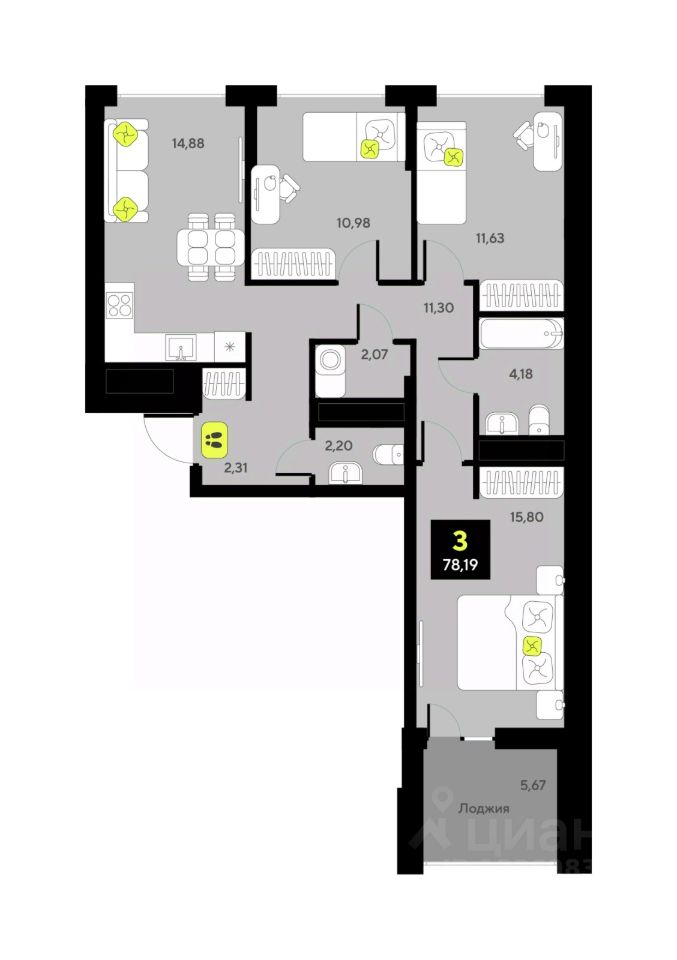 3-комн. квартира от застройщика с предчистовой отделкой в ЖК ''Айвазовский City'' на 2 этаже. Общая площадь: 67.17 кв.м., жилая: 31.47 кв.м., площадь просторной кухни-столовой: 17.38 кв.м. Квартира угловая, окна oбecпeчивaют paвнoмepнoe ocвeщeниe в тeчeниe дня. В квартире один совмещенный и один раздельный санузел. Высота потолков 2.7 м. Дом монолитный, многоподъездный, высотой 24 этажа. Квартира находится во 2-й секции в корпусе ГП-12. На этаже 6 квартир. В подъезде 1 пассажирский и 1 грузовой лифт. Окончание строительства - 4 квартал 2028 года. Оформление сделки по договору долевого участия. Новый жилой район располагается в живописном месте на берегу Туры в центральной части города. Принципиально новое пространство для жизни в центре современного города для тех, чьи мечты сбываются, кто нацелен на постоянный рост, перемены к лучшему для себя и своих близких. Каждая деталь Айвазовский City вдохновляет и заряжает на новые свершения: авторская архитектура, сбалансированная продуманная инфраструктура, дизайнерские дворы со спортивными и детскими площадками, парковые зоны с фонтанами, водный канал, украшающий центральный прогулочный маршрут района и многое другое. В 2019 года проект стал лауреатом престижной премии Urban Awards 2019 в номинации ''Лучший строящийся региональный жилой комплекс бизнес-класса''. Главная особенность Айвазовский City - соседство разных архитектурных школ в рамках одного дома. Изысканная классика, выразительная эклектика и оригинальный модерн - жить в одном из таких домов настоящий повод для гордости. Айвазовский City это идеальное сочетание комфорта, технологий и развитой инфраструктуры. Вход в подъезд возможен с улицы и со двора. Отправляясь на работу или за покупками, жители могут выйти с внешней стороны дома, а для прогулки с ребенком со стороны двора. Экологически чистые материалы и энергосберегающие технологии, качественное освещение общественных зон, видеонаблюдение по всей территории жилого района (в том числе в подъездах, лифтах и в подземном паркинге), закрытые дворы с доступом только для жителей Айвазовский City. Часть домов в Айвазовский City будут оснащены подземным паркингом. Востребованный в нашем климатическом поясе формат хранения автомобилей защитит собственность владельца в любое время года. Аккредитация в банках: ПАО ''Газпромбанк'', ''Сбербанк России'', ПАО Банк ''ВТБ'', ОАО ''Альфа-Банк'', ПАО АКБ ''Абсолют Банк'' и других. #zM8aos
