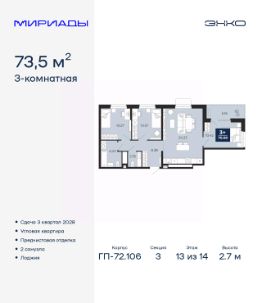 Успейте оформить бронирование, пока действует скидка! Срок акции ограничен! Стоимость квартиры указана со скидкой, ваша экономия составит 482,500 RUB. Информация по телефону, наши менеджеры вам все расскажут! 3-комн. квартира с предчистовой отделкой в ЖК ''Мириады'' на 13 этаже. Общая площадь: 73.5 кв.м., жилая: 30.7 кв.м., площадь просторной кухни-столовой: 24.23 кв.м. Квартира угловая, идеально подойдет любителям тишины и панорамных видов. В квартире одна лоджия, один совмещенный и один раздельный санузел. Высота потолков 2.7 м. Дом монолитный, черырехподъездный, переменной этажности, от 13 до 16 этажей. Квартира находится в 3-й секции высотой 14 этажей в корпусе ГП-72.106. На этаже 6 квартир. В подъезде 1 пассажирский и 1 грузовой лифт. Окончание строительства - 3 квартал 2028 года. Оформление сделки по договору долевого участия. Вселенная бесконечных историй. Ранее невиданный Тюмени масштаб: территория 240 гектаров и 1 650 000 м² застройки. Мириады это город масштабных перемен и больших возможностей. Город зеленых рощ и зеркальных озер. Город для работы, учебы и развлечений. Город для детей и их родителей. Город для всех и каждого. Проект расположен в районе Мыс рядом с ТРЦ ''Тюмень Сити Молл'' в границах улицы Тимофея Чаркова, Тобольского тракта и объездной дороги. Срок полного освоения территории - до 2034 года. #26dAwe
