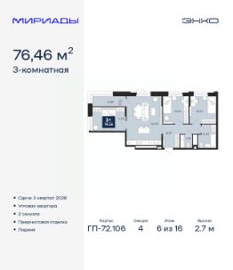 Спешите забронировать по этой цене! Срок акции ограничен! Стоимость квартиры указана со скидкой, ваша экономия составит 485,500 RUB. По всем вопросам звоните в офис продаж, наши менеджеры вам все расскажут! Просторная 3-комн. квартира с предчистовой отделкой в ЖК ''Мириады'' на 6 этаже. Общая площадь: 76.46 кв.м., жилая: 31.31 кв.м., площадь просторной кухни-столовой: 24.59 кв.м. Квартира угловая, очень светлая, естественная вентиляция при открытии окон. В квартире одна лоджия, один совмещенный и один раздельный санузел. Высота потолков 2.7 м. Дом монолитный, черырехподъездный, переменной этажности, от 13 до 16 этажей. Квартира находится в 4-й секции высотой 16 этажей в корпусе ГП-72.106. На этаже 6 квартир. В подъезде 1 пассажирский и 1 грузовой лифт. Окончание строительства - 3 квартал 2028 года. Оформление сделки по договору долевого участия. Вселенная бесконечных историй. Ранее невиданный Тюмени масштаб: территория 240 гектаров и 1 650 000 м² застройки. Мириады это город масштабных перемен и больших возможностей. Город зеленых рощ и зеркальных озер. Город для работы, учебы и развлечений. Город для детей и их родителей. Город для всех и каждого. Проект расположен в районе Мыс рядом с ТРЦ ''Тюмень Сити Молл'' в границах улицы Тимофея Чаркова, Тобольского тракта и объездной дороги. Срок полного освоения территории - до 2034 года. #26DASO