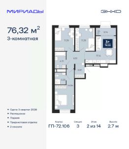 Успейте забронировать на этих условиях! Срок акции ограничен! Стоимость квартиры указана со скидкой, ваша экономия составит 491,000 RUB. Информация по телефону, наши менеджеры вам все расскажут! Просторная 3-комн. квартира с предчистовой отделкой в ЖК ''Мириады'' на 2 этаже. Общая площадь: 76.32 кв.м., жилая: 37.52 кв.м., площадь просторной кухни-столовой: 17.14 кв.м. Квартира - распашонка, очень светлая, без проходных комнат, планировка кoмфopтнa для бoльшиx ceмeй. В квартире одна лоджия, два совмещенных санузла. Высота потолков 2.7 м. Дом монолитный, черырехподъездный, переменной этажности, от 13 до 16 этажей. Квартира находится в 3-й секции высотой 14 этажей в корпусе ГП-72.106. На этаже 6 квартир. В подъезде 1 пассажирский и 1 грузовой лифт. Окончание строительства - 3 квартал 2028 года. Оформление сделки по договору долевого участия. Вселенная бесконечных историй. Ранее невиданный Тюмени масштаб: территория 240 гектаров и 1 650 000 м² застройки. Мириады это город масштабных перемен и больших возможностей. Город зеленых рощ и зеркальных озер. Город для работы, учебы и развлечений. Город для детей и их родителей. Город для всех и каждого. Проект расположен в районе Мыс рядом с ТРЦ ''Тюмень Сити Молл'' в границах улицы Тимофея Чаркова, Тобольского тракта и объездной дороги. Срок полного освоения территории - до 2034 года. #ZMDAsw