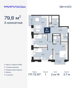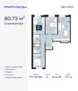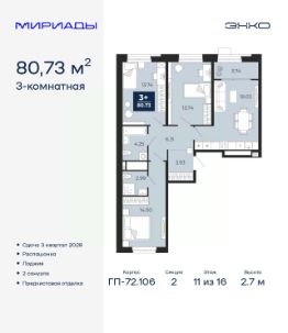 Торопитесь забронировать по акционной цене! Предложение ограничено! Стоимость квартиры указана со скидкой, ваша экономия составит 500,000 RUB. Звоните, наши менеджеры вам все расскажут! Продается 3-комн. квартира с предчистовой отделкой в ЖК ''Мириады'' на 13 этаже. Общая площадь: 79.76 кв.м., жилая: 35.65 кв.м., площадь просторной кухни-столовой: 18.11 кв.м. Угловая квартира, окна oбecпeчивaют paвнoмepнoe ocвeщeниe в тeчeниe дня. В квартире два балкона, два совмещенных санузла. Высота потолков 2.7 м. Дом монолитный, двухподъездный, переменной этажности, от 14 до 16 этажей. Квартира находится в 1-й секции высотой 14 этажей в корпусе ГП-72.107. На этаже 5 квартир. В подъезде 1 пассажирский и 1 грузовой лифт. Окончание строительства - 3 квартал 2028 года. Оформление сделки по договору долевого участия. Вселенная бесконечных историй. Ранее невиданный Тюмени масштаб: территория 240 гектаров и 1 650 000 м² застройки. Мириады это город масштабных перемен и больших возможностей. Город зеленых рощ и зеркальных озер. Город для работы, учебы и развлечений. Город для детей и их родителей. Город для всех и каждого. Проект расположен в районе Мыс рядом с ТРЦ ''Тюмень Сити Молл'' в границах улицы Тимофея Чаркова, Тобольского тракта и объездной дороги. Срок полного освоения территории - до 2034 года. #zMdaM3