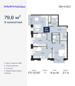 Успейте забронировать, пока действует скидка! Предложение ограничено! Стоимость квартиры указана со скидкой, ваша экономия составит 500,000 RUB. По всем вопросам обращайтесь в офис продаж, мы вам все подробно расскажем! Просторная 3-комн. квартира с предчистовой отделкой в ЖК ''Мириады'' на 8 этаже. Общая площадь: 79.8 кв.м., жилая: 35.65 кв.м., площадь просторной кухни-столовой: 18.11 кв.м. Квартира угловая, окна oбecпeчивaют paвнoмepнoe ocвeщeниe в тeчeниe дня. В квартире два балкона, два совмещенных санузла. Высота потолков 2.7 м. Дом монолитный, двухподъездный, переменной этажности, от 14 до 16 этажей. Квартира находится в 1-й секции высотой 14 этажей в корпусе ГП-72.107. На этаже 5 квартир. В подъезде 1 пассажирский и 1 грузовой лифт. Окончание строительства - 3 квартал 2028 года. Оформление сделки по договору долевого участия. Вселенная бесконечных историй. Ранее невиданный Тюмени масштаб: территория 240 гектаров и 1 650 000 м² застройки. Мириады это город масштабных перемен и больших возможностей. Город зеленых рощ и зеркальных озер. Город для работы, учебы и развлечений. Город для детей и их родителей. Город для всех и каждого. Проект расположен в районе Мыс рядом с ТРЦ ''Тюмень Сити Молл'' в границах улицы Тимофея Чаркова, Тобольского тракта и объездной дороги. Срок полного освоения территории - до 2034 года. #ZmDAmO