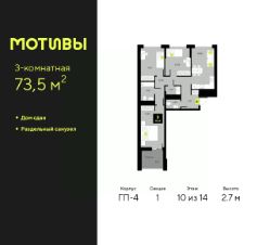 Продается трехкомнатная квартира в ЖК ''Мотивы'' на 10 этаже. Общая площадь: 73.5 кв.м. Высота потолков 2.7 м. Дом монолитный, многоподъездный, переменной этажности, от 5 до 14 этажей. Квартира находится в 1-й секции высотой 14 этажей в корпусе ГП-4. На этаже 5 квартир. В подъезде 1 пассажирский и 1 грузовой лифт. Строительство завершено, дом сдан в 4 квартале 2024 года. Оформление сделки по договору купли-продажи. Закрытая от автомобилей территория, безопасный двор и камеры видеонаблюдения - гаранты вашего спокойствия. Квартал будет располагать богатой инфраструктурой: на первых этажах разместятся магазины, пекарни, кофейни, пункты выдачи, аптеки, детские центры, цветочные салоны и многое другое, что сделает жизнь поистине комфортной. Рядом находится парк общей площадью почти 5000 м², в котором располагаются локации для игр и отдыха жителей, здесь можно совершить утреннюю пробежку или прогуляться после рабочего дня. В парке есть зона воркаута с тренажерами для взрослых, игровые комплексы с горками и канатный комплекс для детей разных возрастов, качели и лавочки для отдыха, площадки для командных видов спорта и для панна-футбола. В ЖК ''Мотивы'' всё продумано до мелочей: светлые холлы входных групп, оформленные в едином стиле, просторные колясочные, лапомойки для питомцев. На территории комплекса находятся 2 8-ми этажных паркинга и более 1000 м/м на открытой парковке. Жилой комплекс находится в одном из экологически благоприятных районов Тюмени, недалеко от Плехановского бора. При этом до центра города можно добраться за 15 минут, а до международного аэропорта Рощино за 13 минут. Окончание строительства: ГП 1, 2, 3, 4 сдача до конца 2024 года, ГП 6, 7, 8 сдача 2 квартал 2026 года. #26D4DE