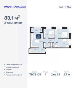 Успейте забронировать на этих условиях! Предложение ограничено! Стоимость квартиры указана со скидкой, ваша экономия составит 500,000 RUB. Звоните, мы вам все подробно расскажем! Просторная трехкомнатная квартира с предчистовой отделкой в ЖК ''Мириады'' на 2 этаже. Общая площадь: 83.1 кв.м., жилая: 37.7 кв.м., площадь просторной кухни-столовой: 21 кв.м. Квартира угловая, идеально подойдет любителям тишины и панорамных видов. В квартире одна лоджия, два совмещенных санузла. Высота потолков 2.7 м. Квартира находится в корпусе ГП-72.105. Дом монолитный, одноподъездный, высотой 23 этажа. На этаже 8 квартир. В подъезде 2 пассажирских и 1 грузовой лифт. Начало строительства - 1 квартал 2026 года. Окончание строительства - 3 квартал 2028 года. Оформление сделки по договору долевого участия. Вселенная бесконечных историй. Ранее невиданный Тюмени масштаб: территория 240 гектаров и 1 650 000 м² застройки. Мириады это город масштабных перемен и больших возможностей. Город зеленых рощ и зеркальных озер. Город для работы, учебы и развлечений. Город для детей и их родителей. Город для всех и каждого. Проект расположен в районе Мыс рядом с ТРЦ ''Тюмень Сити Молл'' в границах улицы Тимофея Чаркова, Тобольского тракта и объездной дороги. Срок полного освоения территории - до 2034 года. #zMda5A