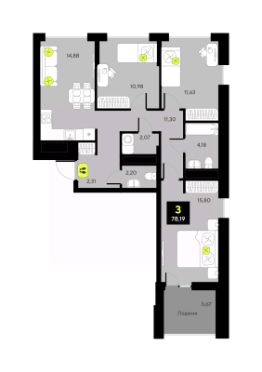 Просторная трехкомнатная квартира в ЖК ''Мотивы'' на 10 этаже. Общая площадь: 73.7 кв.м. Высота потолков 2.7 м. Дом монолитный, многоподъездный, переменной этажности, от 5 до 14 этажей. Квартира находится в 1-й секции высотой 14 этажей в корпусе ГП-4. На этаже 5 квартир. В подъезде 1 пассажирский и 1 грузовой лифт. На сегодняшний день строительство завершено, дом сдан в 4 квартале 2024 года. Оформление сделки по договору купли-продажи. Закрытая от автомобилей территория, безопасный двор и камеры видеонаблюдения - гаранты вашего спокойствия. Квартал будет располагать богатой инфраструктурой: на первых этажах разместятся магазины, пекарни, кофейни, пункты выдачи, аптеки, детские центры, цветочные салоны и многое другое, что сделает жизнь поистине комфортной. Рядом находится парк общей площадью почти 5000 м², в котором располагаются локации для игр и отдыха жителей, здесь можно совершить утреннюю пробежку или прогуляться после рабочего дня. В парке есть зона воркаута с тренажерами для взрослых, игровые комплексы с горками и канатный комплекс для детей разных возрастов, качели и лавочки для отдыха, площадки для командных видов спорта и для панна-футбола. В ЖК ''Мотивы'' всё продумано до мелочей: светлые холлы входных групп, оформленные в едином стиле, просторные колясочные, лапомойки для питомцев. На территории комплекса находятся 2 8-ми этажных паркинга и более 1000 м/м на открытой парковке. Жилой комплекс находится в одном из экологически благоприятных районов Тюмени, недалеко от Плехановского бора. При этом до центра города можно добраться за 15 минут, а до международного аэропорта Рощино за 13 минут. Окончание строительства: ГП 1, 2, 3, 4 сдача до конца 2024 года, ГП 6, 7, 8 сдача 2 квартал 2026 года. #Z6dwDb