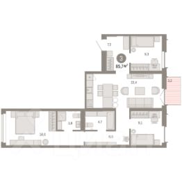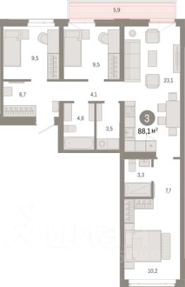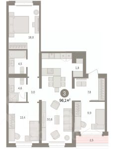 Трехкомнатная квартира с предчистовой отделкой в Кварталы ''На Минской'' на 4 этаже. Общая площадь: 96.11 кв.м., жилая: 41.3 кв.м., площадь просторной кухни-гостиной: 30.6 кв.м. Квартира - распашонка, без проходных комнат, окна выходят на paзные стороны дома. В квартире одна лоджия, два совмещенных санузла. Высота потолков 2.7 м. Дом монолитный, многоподъездный, переменной этажности, от 7 до 16 этажей. Квартира находится в 3-й секции высотой 7 этажей в корпусе 1. На этаже 5 квартир. В подъезде 1 грузовой лифт. Окончание строительства - 4 квартал 2026 года. Оформление сделки по договору долевого участия. Квартира с кухней-гостиной и тремя спальнями в кварталах ''На Минской''. Особенности планировки: балкон, окна на две стороны, окно в санузле, предчистовая отделка, разнесённые спальни. квартиры в нашей базе: МНС01-Ж3.4.5. В сердце города Кварталы ''На Минской'' находятся в самом центре. За десять минут можно дойти до площади 400-летия Тюмени и Большого Драматического театра, Тюменского индустриального и медицинского университетов, спортивного комплекса ''Строймаш'', ТРЦ ''Гудвин'' и ''Премьер'', Тюменского технопарка. Поблизости много детских садов, школ и поликлиник. Пространство разного опыта Создавая кварталы ''На Минской'' мы вдохновлялись Хакскими дворами в Берлине и улицей Давида Агмашенебели в Тбилиси. И первые и вторая — яркие разнообразные пространства, сформированные прогрессивными архитекторами и притягивающие городских интеллектуалов. Престижная недвижимость здесь соседствует с барами, ресторанами, креативными кластерами и бюро, дизайнерскими лавками. Полезные улицы Кварталы ''На Минской'' свяжет сеть променадов, автомобильных проездов и велодорожек. Уличный фронт проекта мы сформируем с помощью аллейной посадки деревьев. Они создадут тень для ресторанов и кафе на первых этажах, визуально отделят проезжую и пешеходную части, снизят объём пыли и уровень шума. Мы реализуем проект в районе с развитой базовой инфраструктурой. И поэтому тщательно подошли к программированию коммерции, посчитав, что её основная задача — ''закрывать'' более высокие потребности жителей. Здесь может появиться пекарня с вкусными круассанами, турагентство на случай, если захочется перезимовать в Сочи, массажный кабинет, ресторан, когда надоело есть дома и многое другое. #zw7E7w