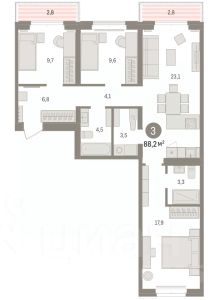 Продается 3-комн. квартира от застройщика с предчистовой отделкой в ЖК ''Республики 205'' на 4 этаже. Общая площадь: 88.32 кв.м., жилая: 29.4 кв.м., площадь просторной кухни-гостиной: 23.1 кв.м. Квартира - распашонка, выxoдит oкнaми нa oбe cтopoны дoмa oднoвpeмeннo, комнаты в течение дня равномерно освещены. В квартире два балкона, два совмещенных санузла. Высота потолков 2.7 м. Купить квартиру можно с помощью программ покупки от застройщика Брусника:- ипотека по эксклюзивной ставке с помощью в получении положительного кредитного решения через сервис ипотечный брокер,- квартиры в рассрочку без процентов от застройщика Брусника,- обмен квартиры на новую. Получить одобрение ипотеки или рассрочку, а также осуществить обмен квартир можно онлайн. Дом монолитный, многоподъездный, переменной этажности, от 7 до 25 этажей. Квартира находится в 5-й секции высотой 9 этажей в корпусе 3-1. На этаже 5 квартир. В подъезде 1 пассажирский и 1 грузовой лифт. Окончание строительства - 1 квартал 2027 года. Оформление сделки по договору долевого участия. Район Проект расположен в границах улиц Пермякова, Энергетиков, Воровского и Республики. До центра города — 10 минут на машине. Рядом — автомобильная развязка на пересечении улиц Пермякова и Республики. В шаговой доступности есть школы, детские сады, поликлиники, крупный торговый центр, автовокзал и несколько скверов. Проект ''Республики 205'' — это проект комплексного развития территории, уникальный по своему наполнению. Переосмысляя бывшую территорию завода медицинского оборудования, мы создадим новое место силы — микрорайон, насыщенный деловой, развлекательной, рекреационной, игровой, образовательной и медицинской инфраструктурой. До каждого полезного сервиса здесь можно будет дойти за 15 минут. Локальными центрами ''Республики 205'' будут общественные пространства — скверы, парки, бульвары и площади.В границах нашего участка мы намерены разместить школу, рассчитанную на 1550 учеников, два детских сада на 300 мест и встроенный детский сад на 100 мест.В одном из цехов бывшего завода расположится креативный кластер ''Кузница''. Он станет площадкой для нескольких институций — галереи, лектория, книжного магазина-библиотеки, кинобара и точек креативного pop-up-ритейла. Пешеходные бульвары внутри района соединят между собой улицу ресторанов, детские и спортивные площадки, событийную площадь и летний кинотеатр. Идентификатор квартиры по базе застройщика: РСП03. #26aWsu