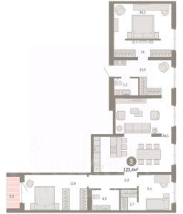 Трехкомнатная квартира от застройщика с предчистовой отделкой в Кварталы ''На Минской'' на 10 этаже. Общая площадь: 123.35 кв.м. Высота потолков 2.7 м. Дом монолитный, многоподъездный, переменной этажности, от 7 до 11 этажей. Квартира находится в 5-й секции высотой 11 этажей в корпусе 2. На этаже 8 квартир. В подъезде 1 пассажирский и 1 грузовой лифт. Окончание строительства - 1 квартал 2027 года. Оформление сделки по договору долевого участия. Квартира с кухней-гостиной и тремя спальнями в кварталах ''На Минской''. Особенности планировки: балкон, предчистовая отделка, разнесённые спальни. квартиры в нашей базе: МНС02-Ж5.10.1. В сердце города Кварталы ''На Минской'' находятся в самом центре. За десять минут можно дойти до площади 400-летия Тюмени и Большого Драматического театра, Тюменского индустриального и медицинского университетов, спортивного комплекса ''Строймаш'', ТРЦ ''Гудвин'' и ''Премьер'', Тюменского технопарка. Поблизости много детских садов, школ и поликлиник. Пространство разного опыта Создавая кварталы ''На Минской'' мы вдохновлялись Хакскими дворами в Берлине и улицей Давида Агмашенебели в Тбилиси. И первые и вторая — яркие разнообразные пространства, сформированные прогрессивными архитекторами и притягивающие городских интеллектуалов. Престижная недвижимость здесь соседствует с барами, ресторанами, креативными кластерами и бюро, дизайнерскими лавками. Полезные улицы Кварталы ''На Минской'' свяжет сеть променадов, автомобильных проездов и велодорожек. Уличный фронт проекта мы сформируем с помощью аллейной посадки деревьев. Они создадут тень для ресторанов и кафе на первых этажах, визуально отделят проезжую и пешеходную части, снизят объём пыли и уровень шума. Мы реализуем проект в районе с развитой базовой инфраструктурой. И поэтому тщательно подошли к программированию коммерции, посчитав, что её основная задача — ''закрывать'' более высокие потребности жителей. Здесь может появиться пекарня с вкусными круассанами, турагентство на случай, если захочется перезимовать в Сочи, массажный кабинет, ресторан, когда надоело есть дома и многое другое. #2SsCaD