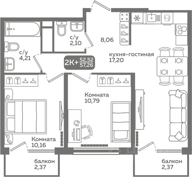 52 м² · Этаж 10 из 21