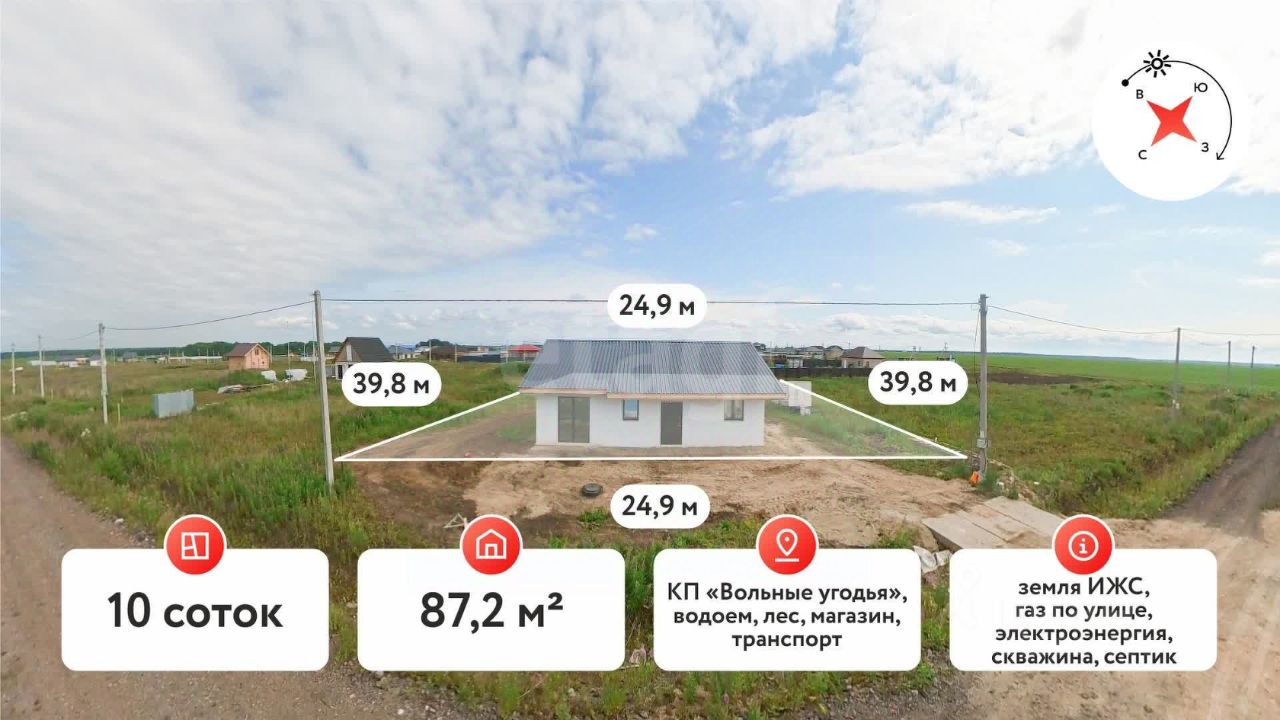 Покупай сейчас - плати потом! На данный объект доступна рассрочка на выгодных условияхСРОЧНО! Цена ниже рыночной!2к дом, на гарантии!Часто спрашивают ''Стены из гипсокартона?'' - Ответ: ''нет, стены не из гипсокартона''Уважаемые покупатели! Предлагаем вам уникальную возможность стать владельцем замечательного дома площадью 53 м² с уютной террасой на обширном участке в 10 соток (ИЖС) в живописном коттеджном посёлке ''Вольные угодья''.Этот дом построен на прочных 3-метровых сваях по инновационной скандинавской технологии, что обеспечивает ему высокую энергоэффективность. Вам не придется беспокоиться о высоких счетах за отопление и кондиционирование комфорт и экономия идут рука об руку! Утепление выполнено с использованием качественной минеральной ваты: пол и потолок утеплены на 200 мм, а стены на 250 мм, что гарантирует отличную теплоизоляцию.При входе в дом вас встречает просторная гардеробная, а также две светлые комнаты, санузел и большая кухня-гостиная с выходом на террасу, где вы сможете наслаждаться утренним кофе или вечерними посиделками с друзьями на свежем воздухе.В доме уже проведены все необходимые коммуникации: вода из скважины, электричество с выведенными местами под розетки и современная канализация (септик). Вам не придется тратить время на дополнительные подключения просто заезжайте и наслаждайтесь жизнью в вашем новом доме!Гарантия на дом сроком 5 лет, что подтверждает высокое качество строительства и материалов.Возможен обмен на КВАРТИРУНе упустите свой шанс! Звоните или пишите нам, и мы с радостью организуем показ в любое удобное для вас время. Ваш новый дом ждет вас!МЫ ГАРАНТИРУЕМ ФИНАНСОВУЮ БЕЗОПАСНОСТЬ ДЛЯ НАШИХ КЛИЕНТОВ.Код пользователя: 163876Номер в базе: 1928015