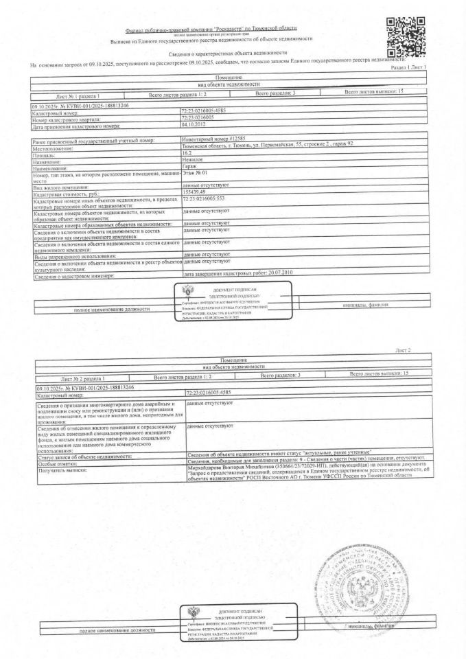 Данные получены с сайта ГИС Торги. Должник: Плетнев А.А., собственник: Плетнев А.А. Лот: Нежилое помещение (гараж), площадь 16,2 кв.м., кадастровый номер: 72:23:0216005:4585, г. Тюмень, ул. Первомайская, д. 55, стр. 2, гараж 92, н/ц: 339700 р., з-к: 50955 р., код: 0001, рег. 72-011150