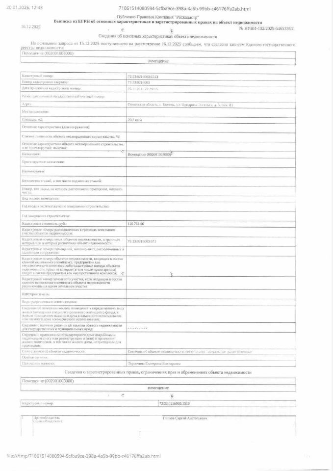 Данные получены с сайта ГИС Торги. Должник: Попков С.А., собственник: Попков С.А. Лот: Нежилое помещение (гараж), площадь 20,7 кв.м., кадастровый номер: 72:23:0216003:1513, г. Тюмень, ул. Фридриха Энгельса, д. 5, пом. 81, н/ц: 234500 р., з-к: 35175 р., код: 0001, рег. 72-011256
